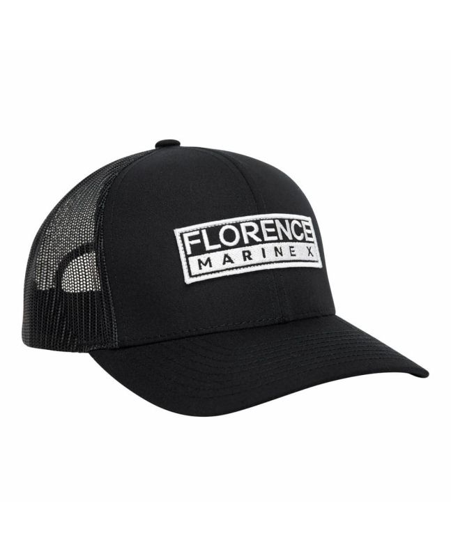 La gorra de estilo camionero para hombre Trucker Hat negra tiene una etiqueta de garantía Florence Marine X cosida en el cierre.