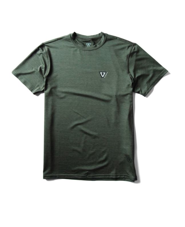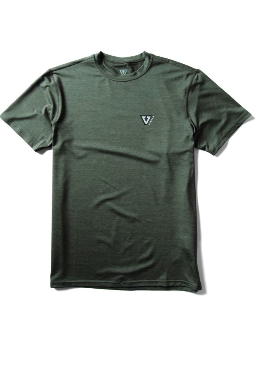 La camiseta de protección solar de manga corta para hombre Twisted ECO SS Lycra Rashguard UPF 50+ en tono verde militar (Military Heather) de Vissla está confeccionada con 85% poliéster reciclado y 15% elastano reciclado (5oz).