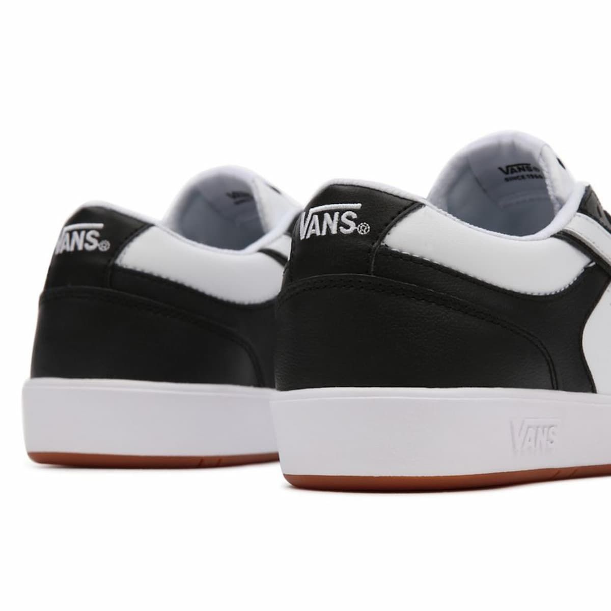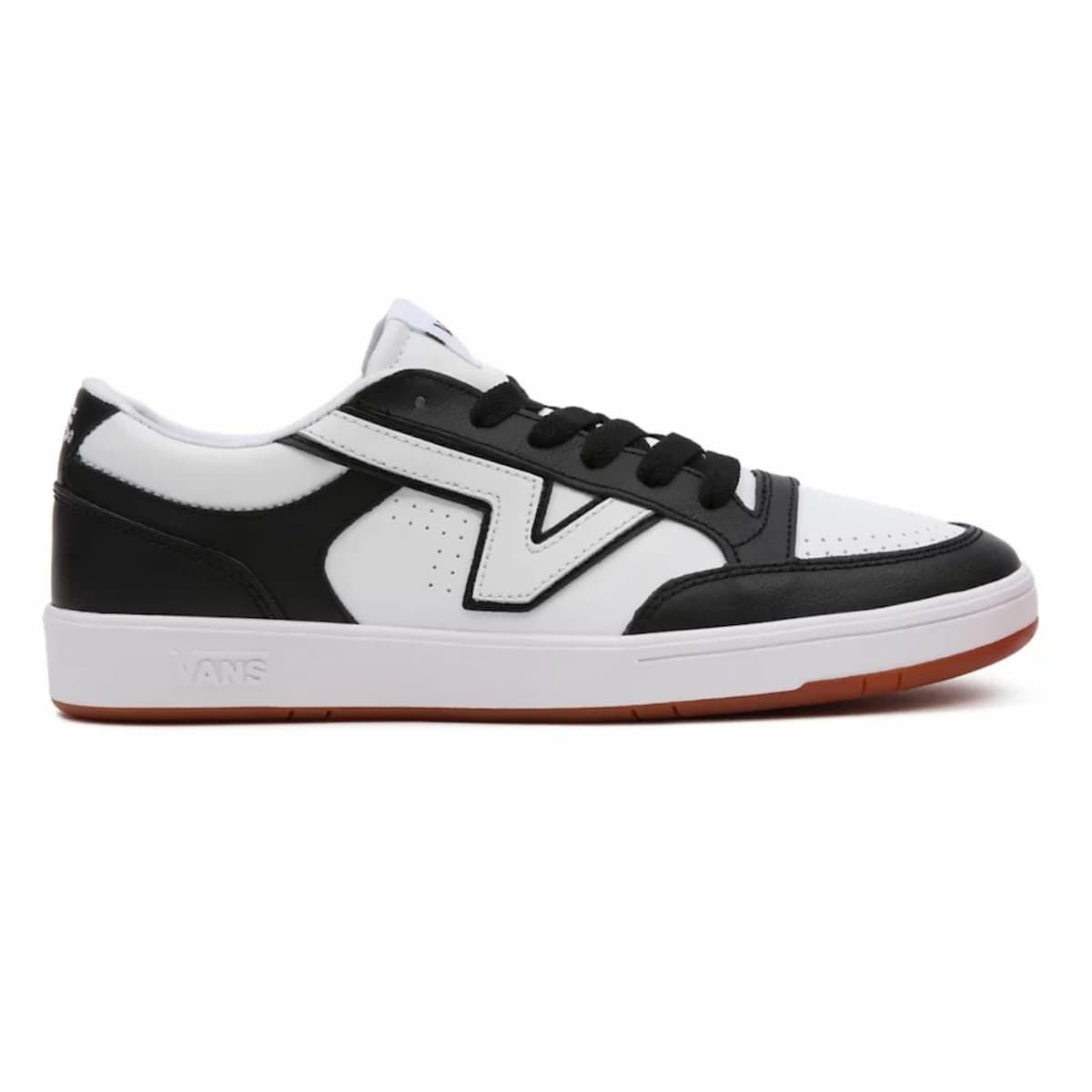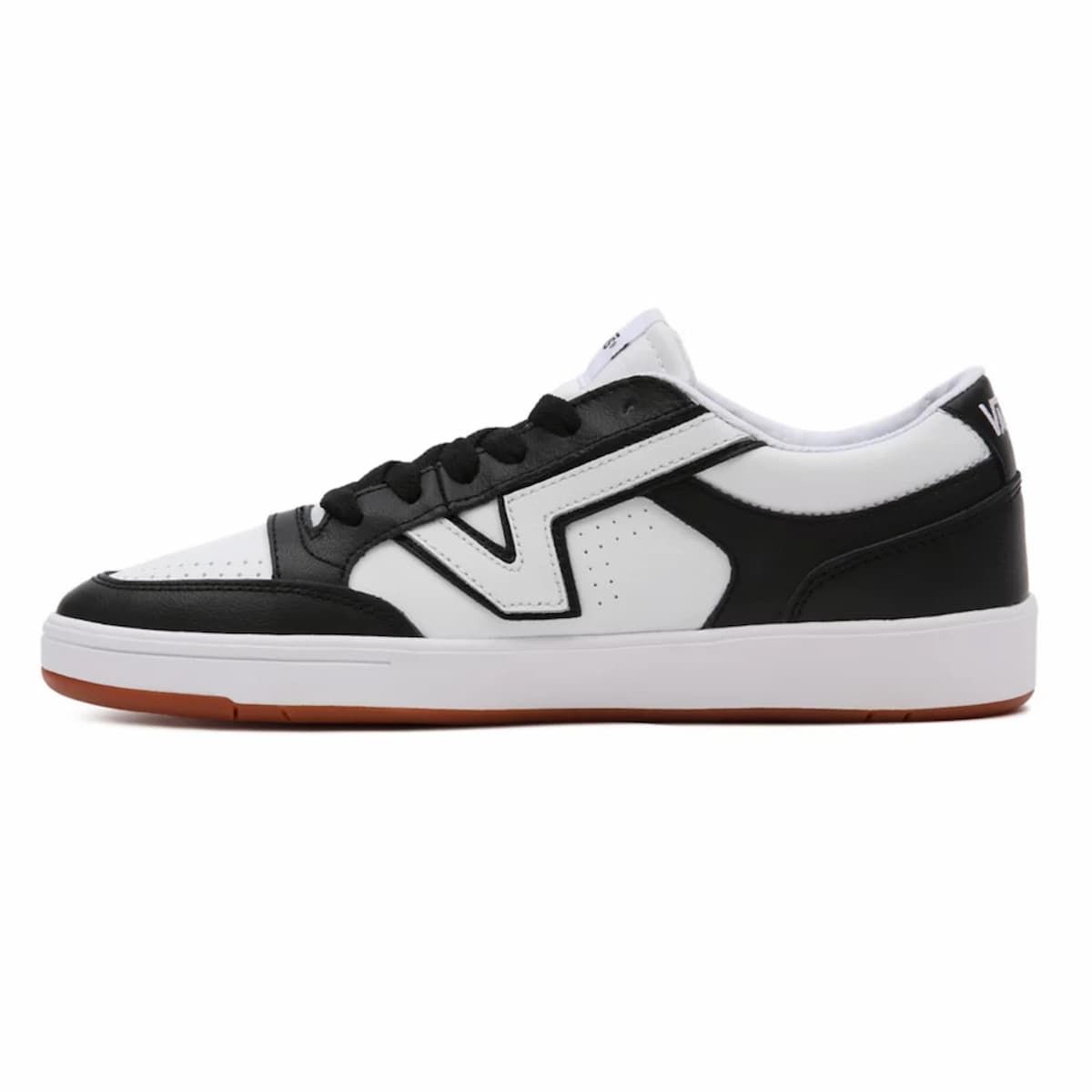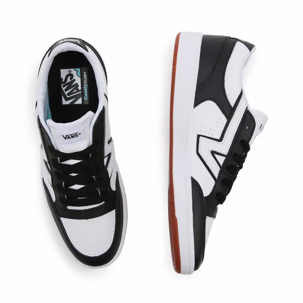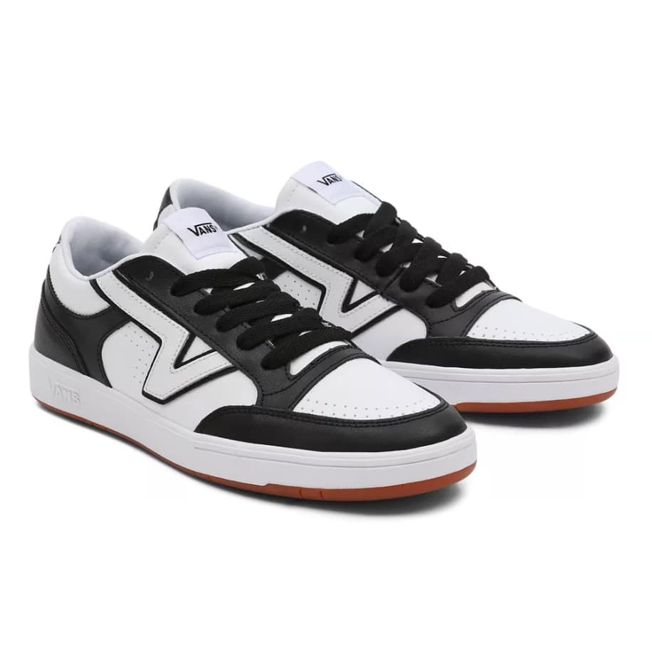 Las Two-Tone Lowland Comfycush blancas y negras cuentan con resistentes palas de cuero y material sintético, cuello acolchado, cierre de cordones y el logo clásico de "V alargada" de Vans (Flying V).
