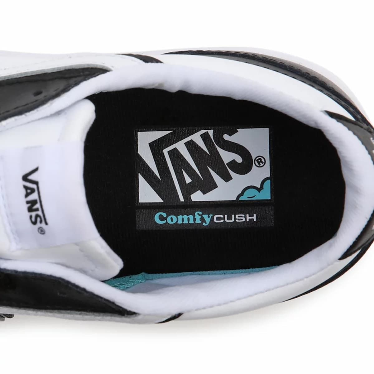 Las zapatillas para hombre Two-Tone Lowland ComfyCush en color blanco y negro tienen una etiqueta de garantía Vans cosida en la lengüeta.