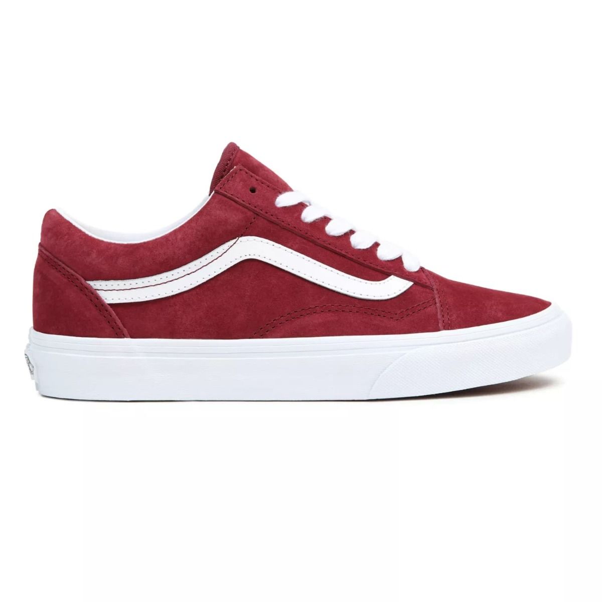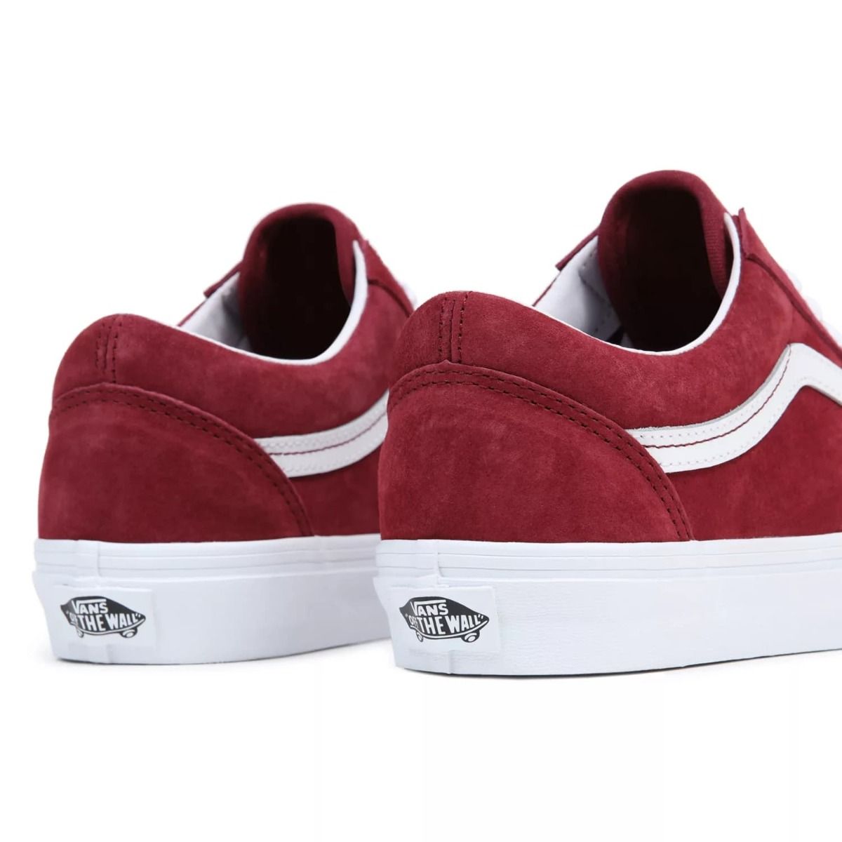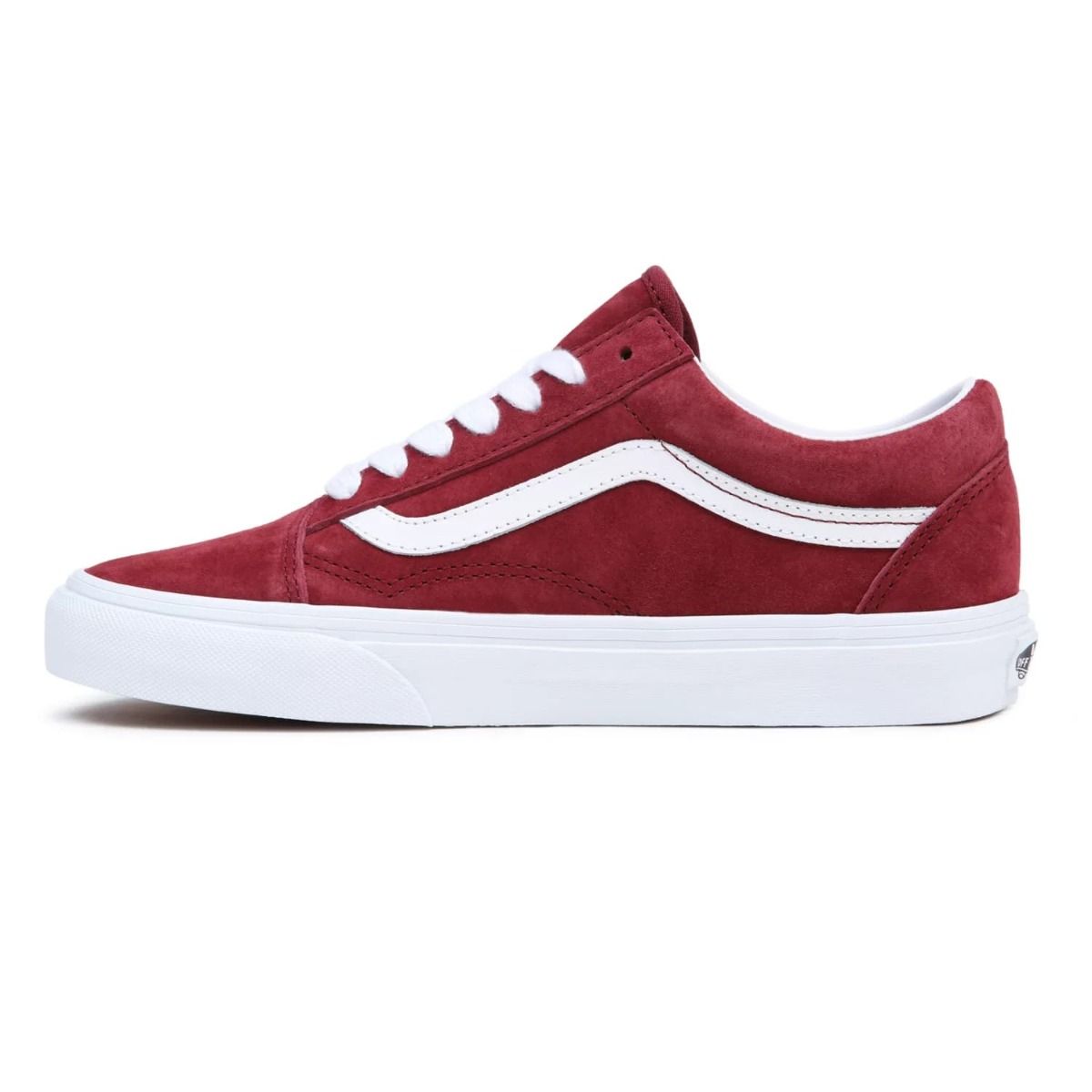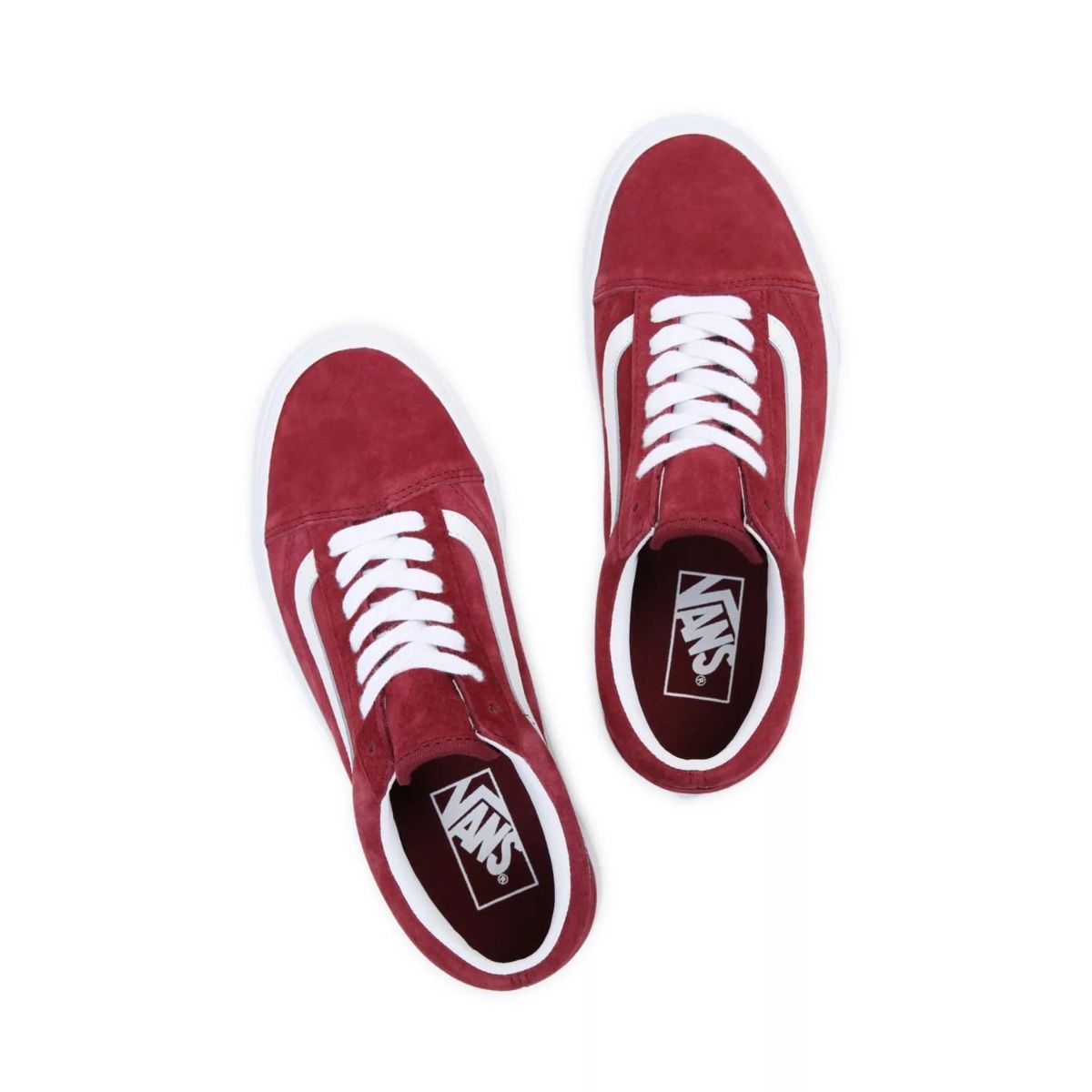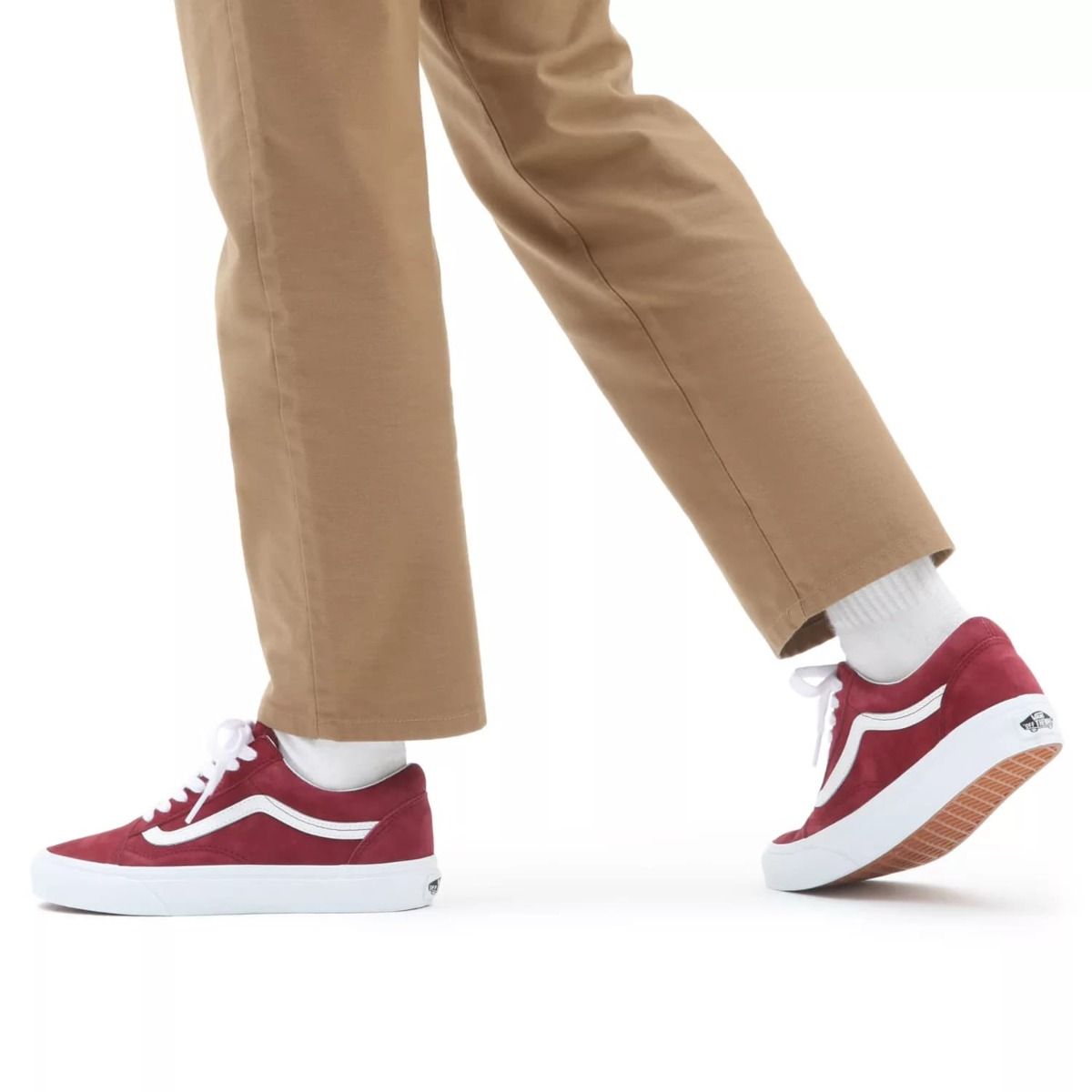 Las Zapatillas para hombre y mujer Old Skool en granate con la banda lateral en blanco (Pig Suede Tawny Port) han sido confeccionadas con ante de cerdo y caucho.