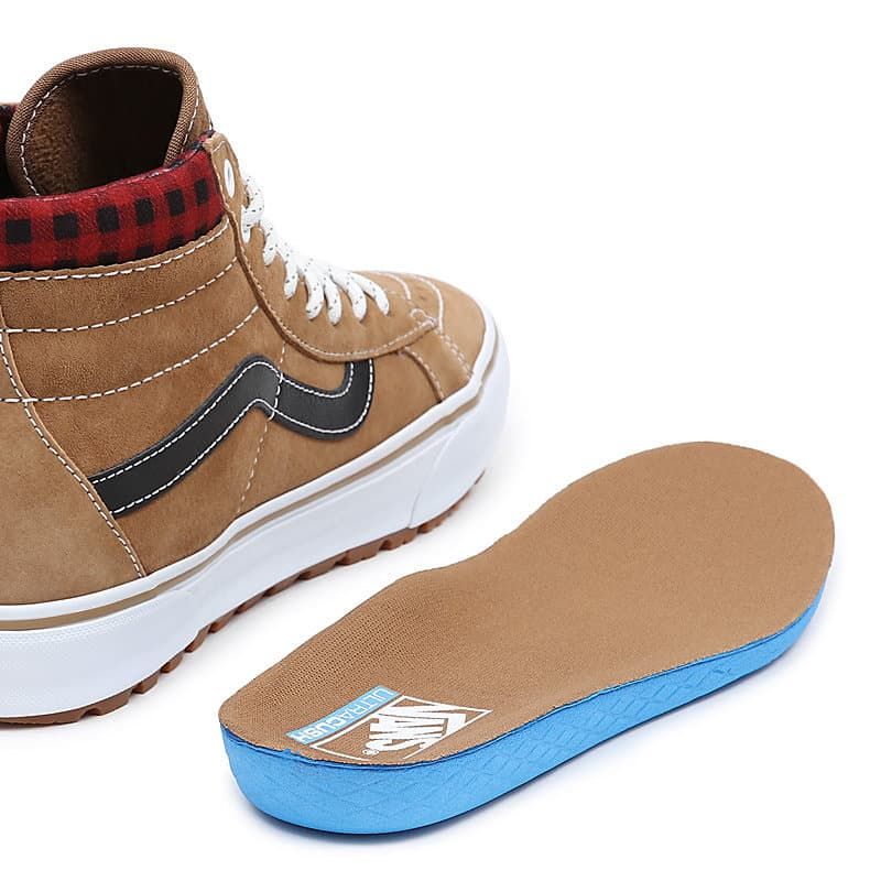 Las Sk8-Hi MTE-1 Plaid cuentan con palas de cuero y tela, revestimiento MTE-1 Hydroguard™ Wrap para una impermeabilización fiable, cómoda y transpirable, aislante zonal Primaloft® con sistema de aislamiento térmico de microfibra de alta calidad que te aportará calor sin retener humedad, puntadas estratégicas para ofrecerte la máxima versatilidad, plantilla ligera de EVA Moldeada UltraCush™ de una sola capa para mayor comodidad y la distintiva suela waffle de Vans reticulada para ofrecerte un agarre más firme.