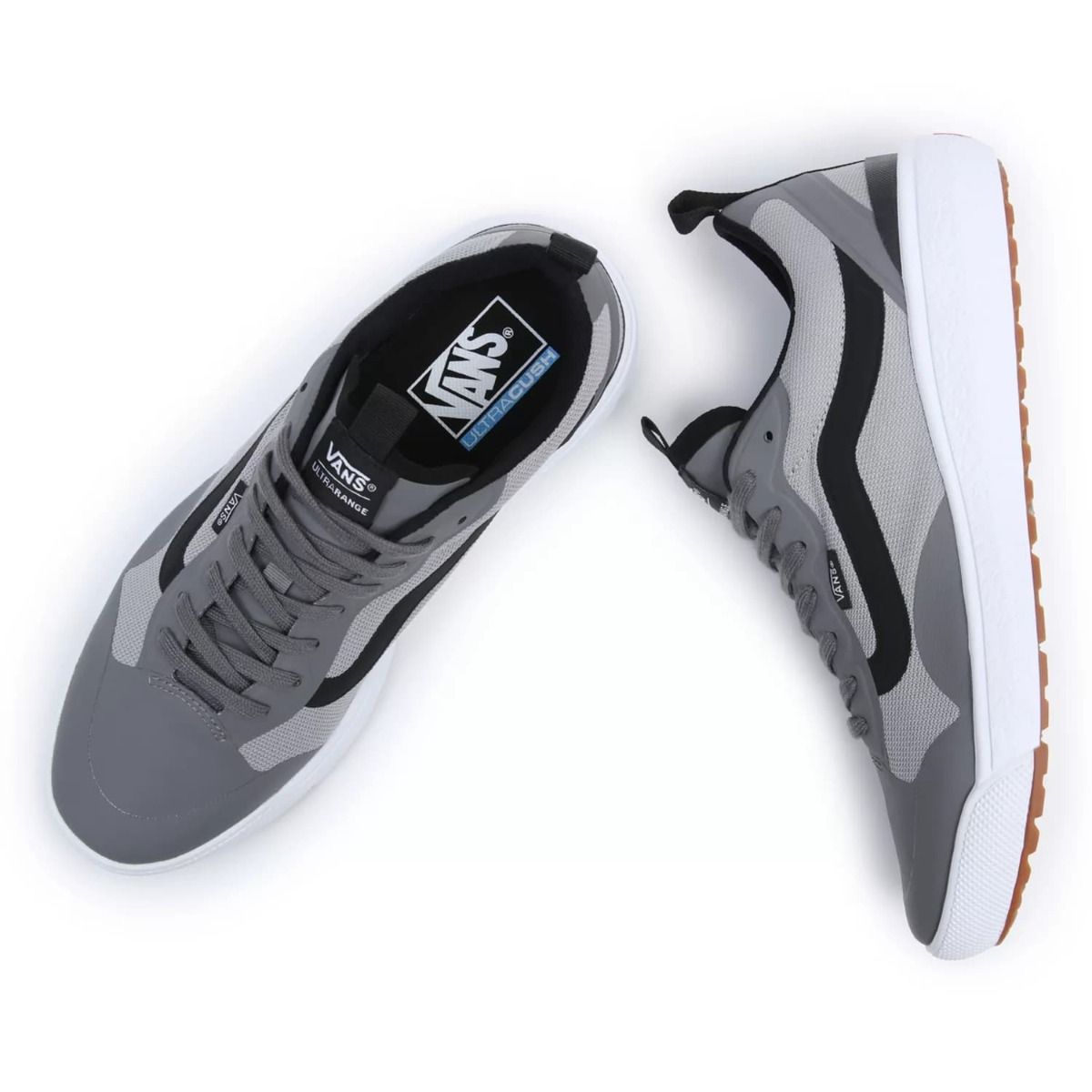 Las zapatillas para hombre UltraRange EXO en gris y blanco con la banda lateral sidestripe en negro (Pewter/White) de Vans han sido confeccionadas con tela, materiales sintéticos y caucho.