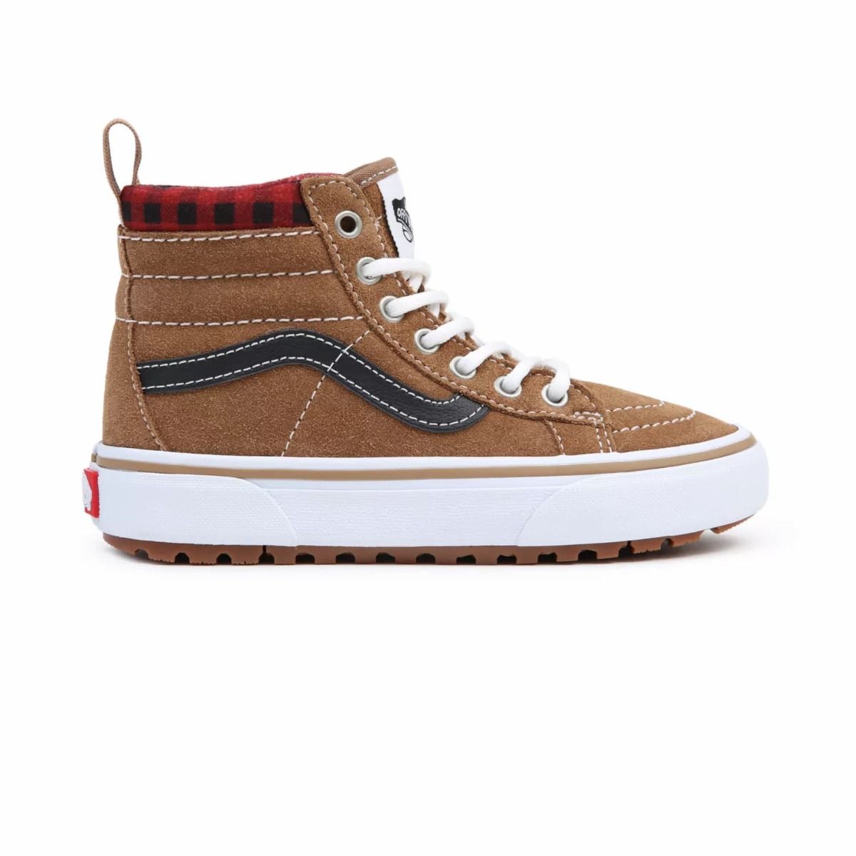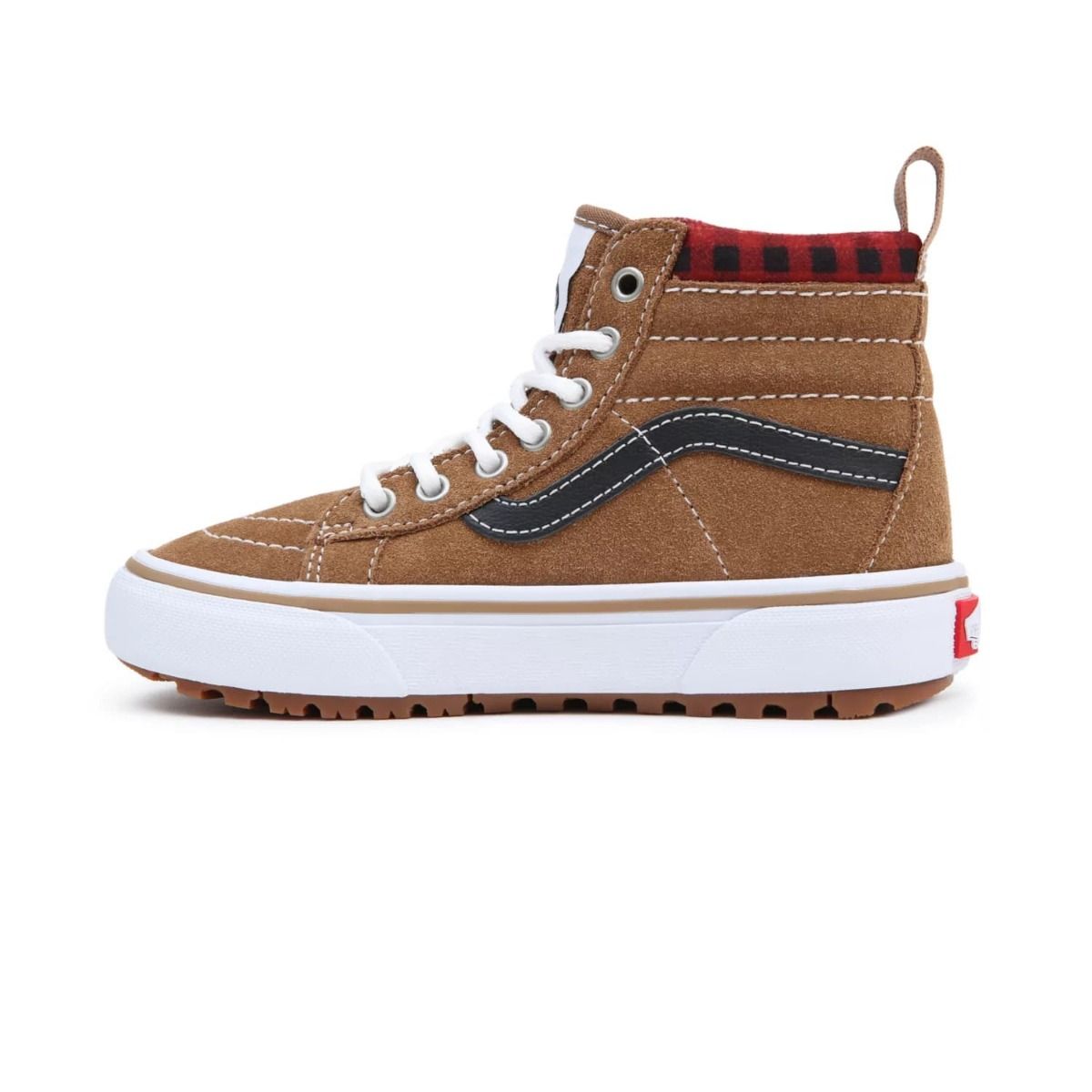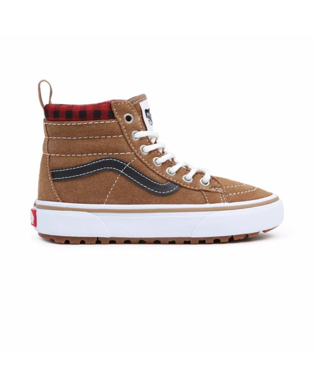Las Zapatillas para niños y niñas de 4 a 8 años SK8-Hi MTE-1 Plaid en marrón con la banda lateral en negro (Brown-Black) de Vans han sido confeccionadas con ante, tela y caucho.