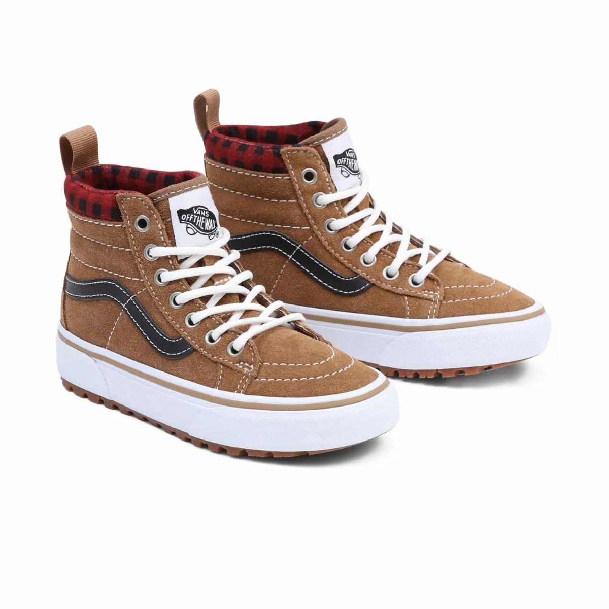 Las Sk8-Hi MTE-1 Plaid para niño en marrón cuentan con revestimiento Hydroguard™ para una impermeabilización fiable, cómoda y transpirable, aislante zonal Primaloft® con sistema de aislamiento térmico de microfibra de alta calidad, puntadas estratégicas para ofrecerte la máxima versatilidad, plantilla ligera de EVA Moldeada UltraCush™ de una sola capa para mayor comodidad y la distintiva suela waffle de Vans reticulada para ofrecerte un agarre más firme.