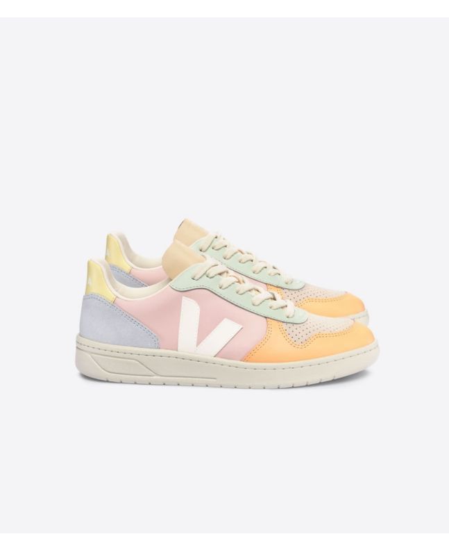 Las zapatillas de cuero para mujer V-10 Leather Petale White Multico de Veja son un calzado deportivo muy cómodo que destaca por su diseño de colores suaves y cálidos en tonos rosa, blanco, lavanda, melocotón y beige, que podrás combinar fácilmente con diferentes estilos y atuendos. Ya sea que desees lucir un look casual y desenfadado o agregar un toque de color a un conjunto más sofisticado.