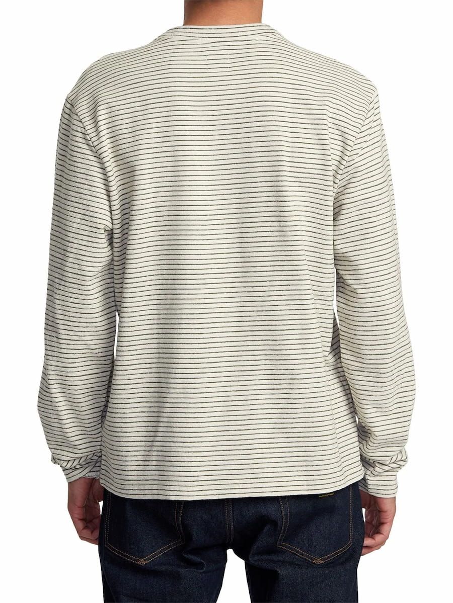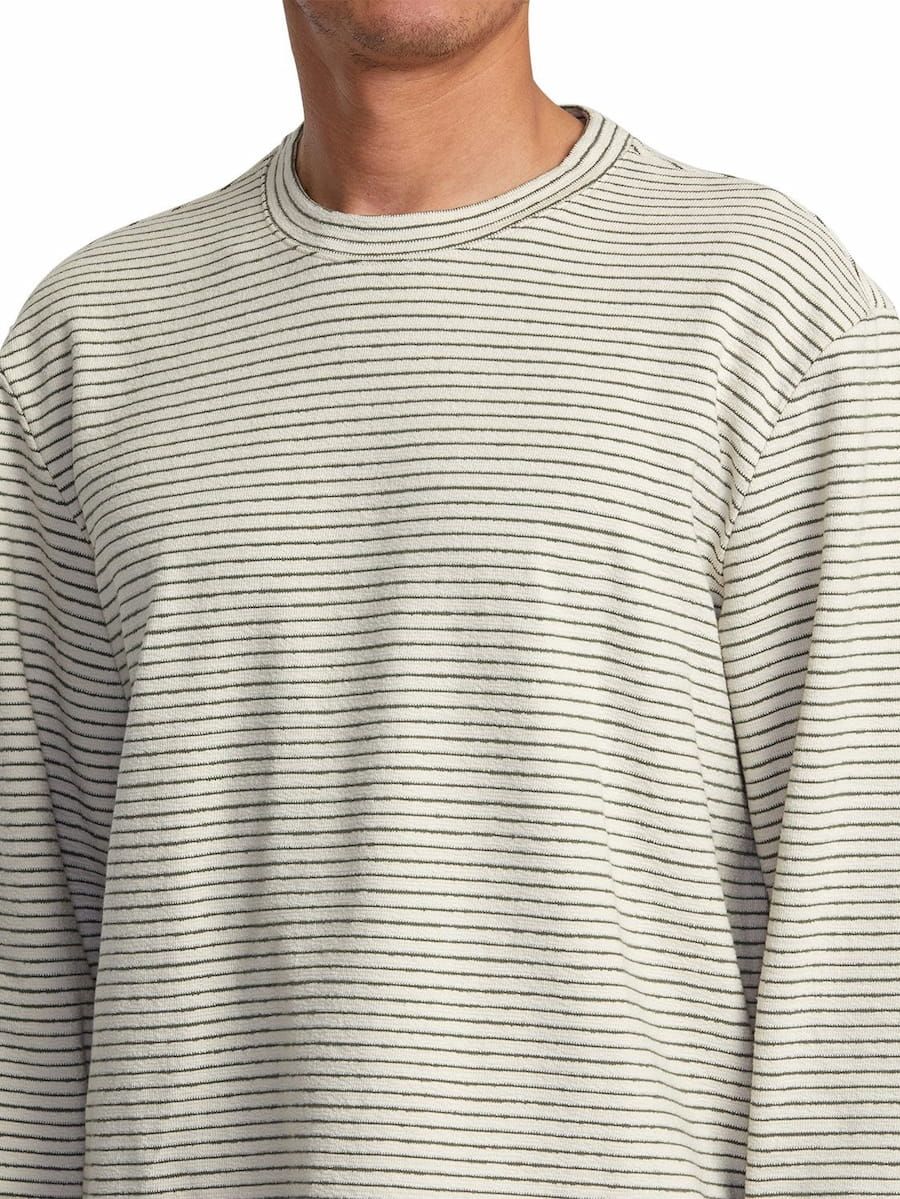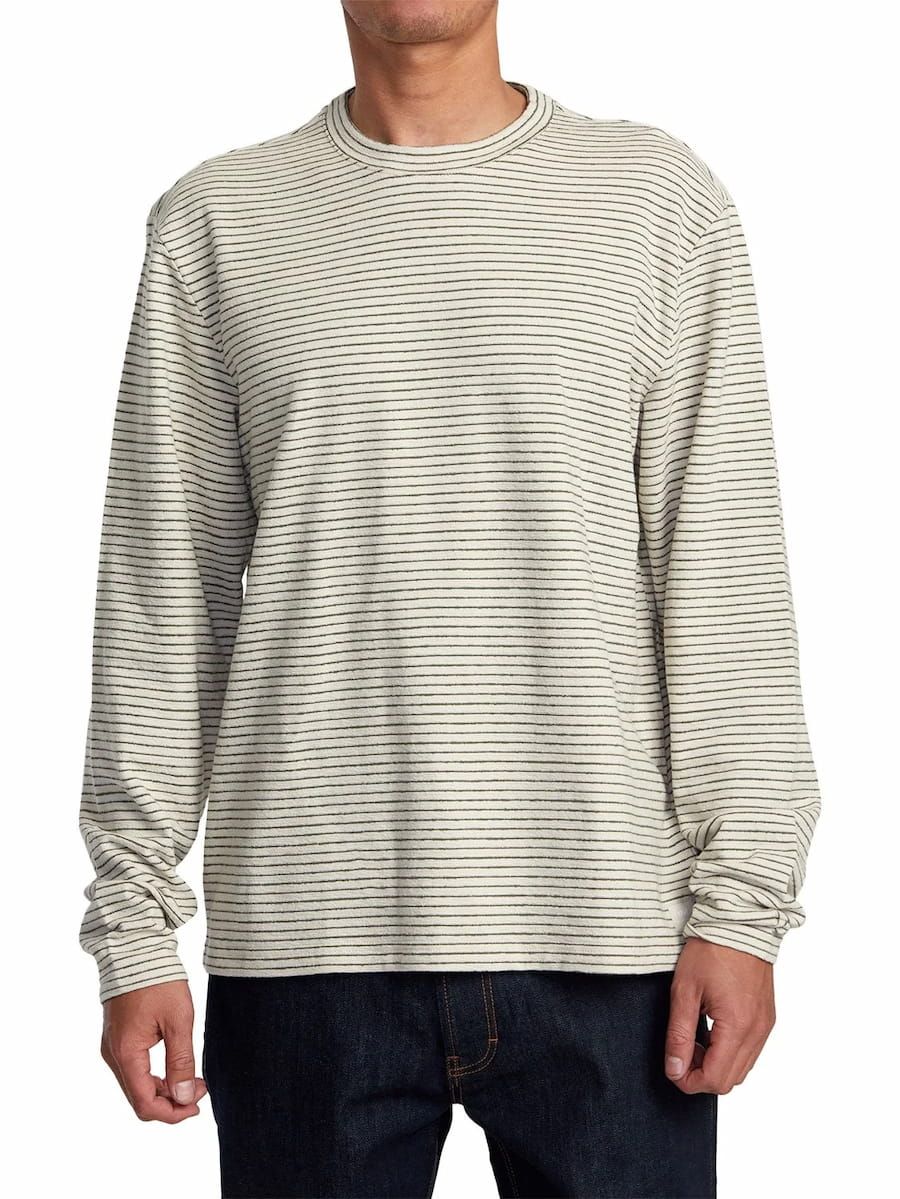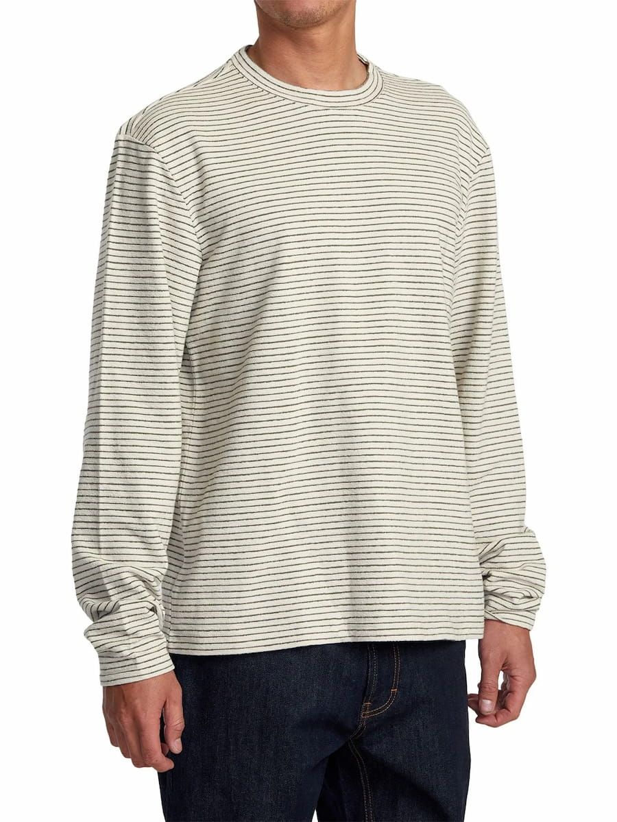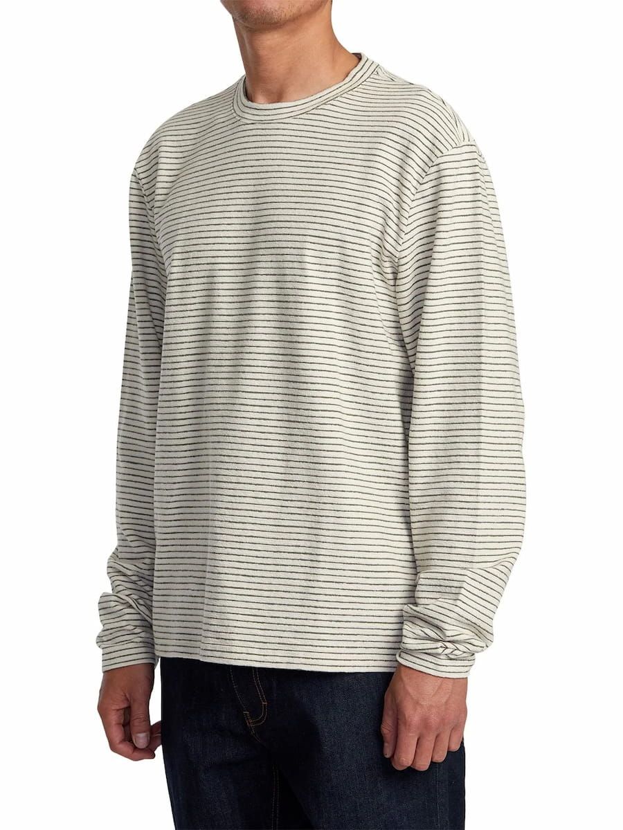 La camiseta de manga larga para hombre Vacancy Crew LS en tono blanco con rayas negras (Ecru) de RVCA está confeccionada con tejido suave de 100% algodón texturizado (240g).