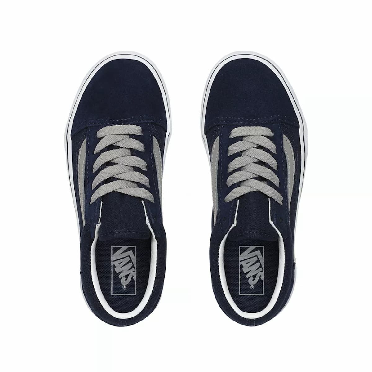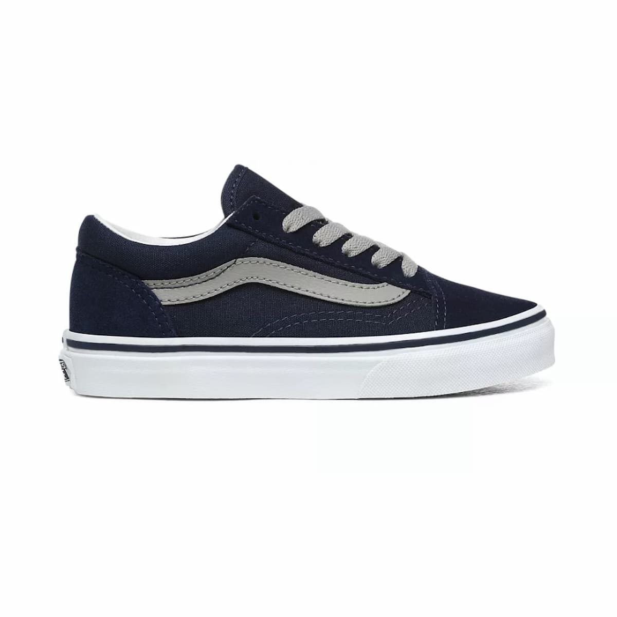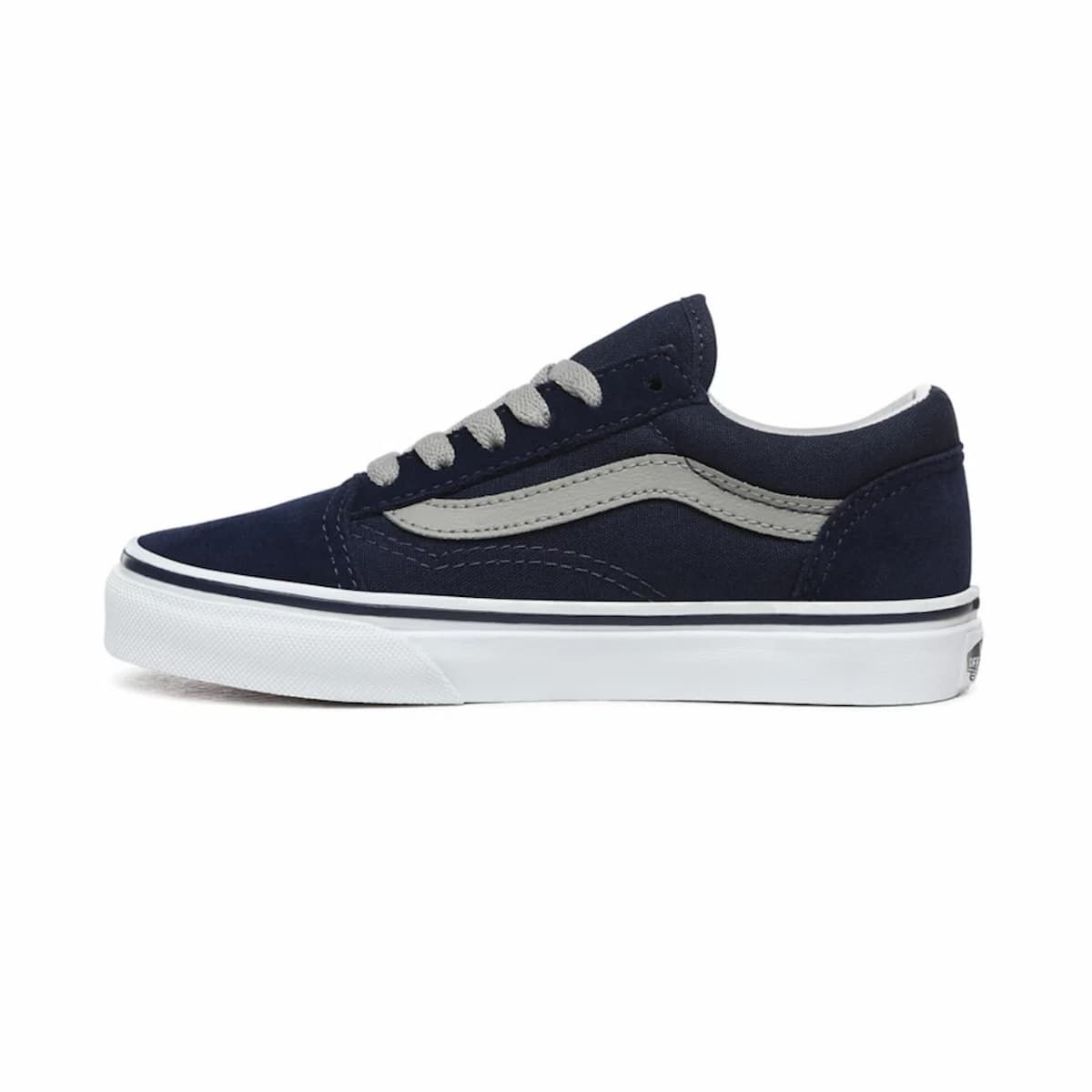 Las zapas para niños de 4 a 8 años Old Skool en color azul marino y banda lateral sidestripe gris (Dress Blues Drizzle) son unas deportivas bajas con cordones, pala de ante y lona muy resistente, puntera reforzada para soportar toda la caña que quieras darles, cuello acolchado para mayor sujeción y flexibilidad, e incluyen la característica suela reticular waffle de goma de Vans.