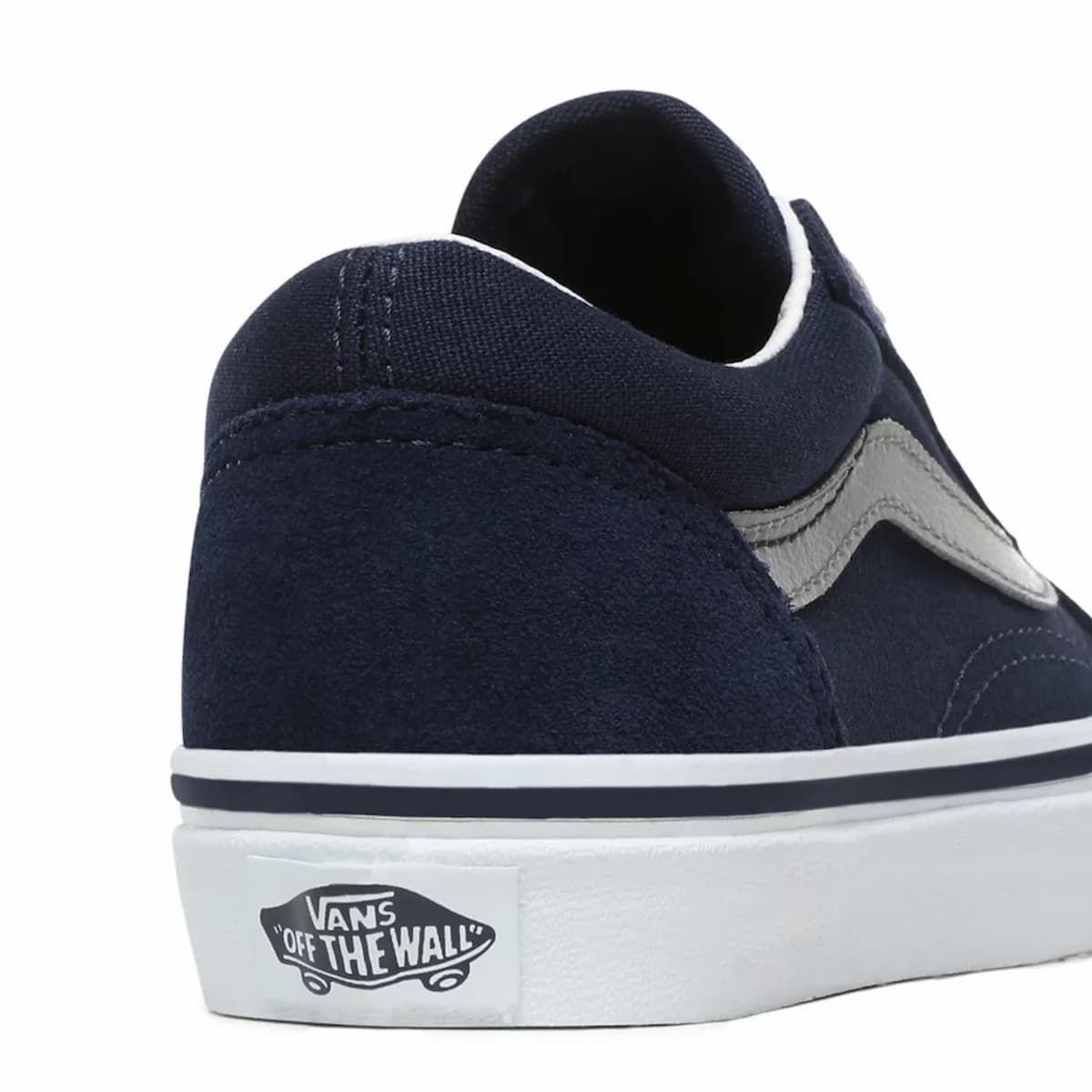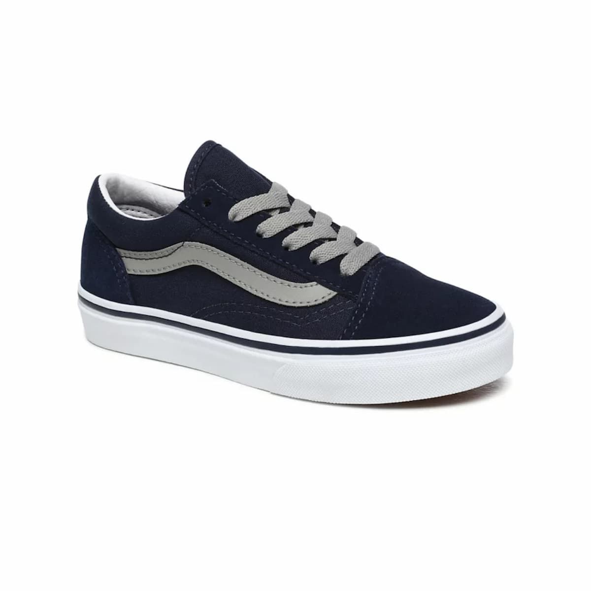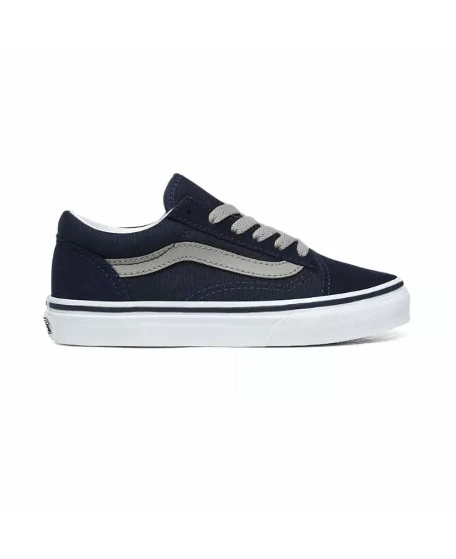 Las zapas para niños de 4 a 8 años Old Skool en color azul marino y banda lateral sidestripe gris (Dress Blues Drizzle) son unas deportivas bajas con cordones, pala de ante y lona muy resistente, puntera reforzada para soportar toda la caña que quieras darles, cuello acolchado para mayor sujeción y flexibilidad, e incluyen la característica suela reticular waffle de goma de Vans.