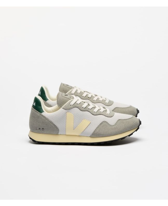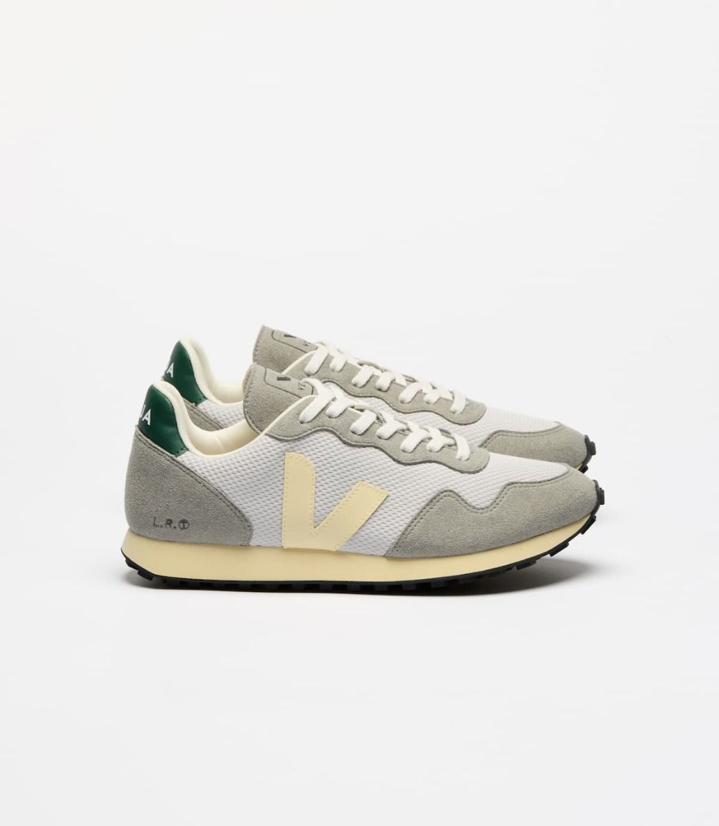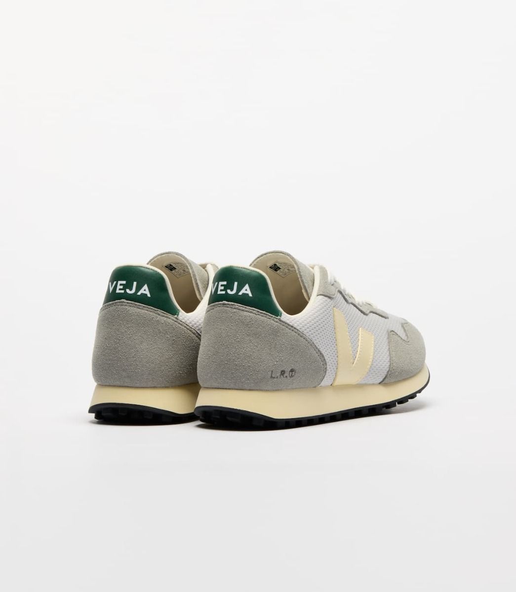 Estas zapatillas Unisex cómodas y sostenibles cuentan con paneles de gamuza 100% vegana y C.W.L. de microfibras punzonadas e impregnadas con resina de PU, procesadas sin disolventes y procedente del Estado de São Paulo en Jacareí, el característico logotipo en contraste y forma de V de Veja en tono amarillo mantequilla hecho de residuos de arroz (23%) y caucho amazónico (26%), cordones blancos de 100% algodón orgánico, una plantilla elaborada con caña de azúcar, caucho amazónico, algodón orgánico y acetato de vinilo etileno reciclado, una suela intermedia de 53% de caña de azúcar, junto con una suela vulcanizada de origen biológico hecha a partir de residuos de arroz (30%) y caucho silvestre del Amazonas (12%).
