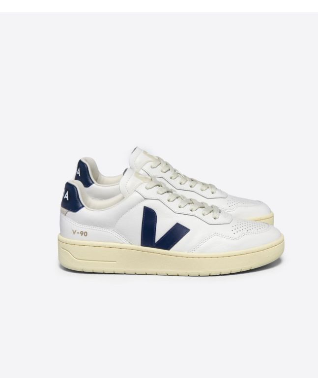 Las deportivas V-90 Leather White Nautico vienen con cordones de 100% algodón orgánico certificado, paneles blancos de cuero O.T., el icónico logo en "V" de Veja en color azul marino en los laterales fabricado con gamuza, suela externa de caucho del Amazonas (12%), sílice mineral (30%), caucho sintético (49%) y otros materiales (9%), plantilla de origen biológico elaborada con caña de azúcar (42%), caucho amazónico (11%), E.V.A.* reciclado (11%), algodón orgánico (12%) y otros materiales (14%) y forro Tech de 100% poliéster reciclado.