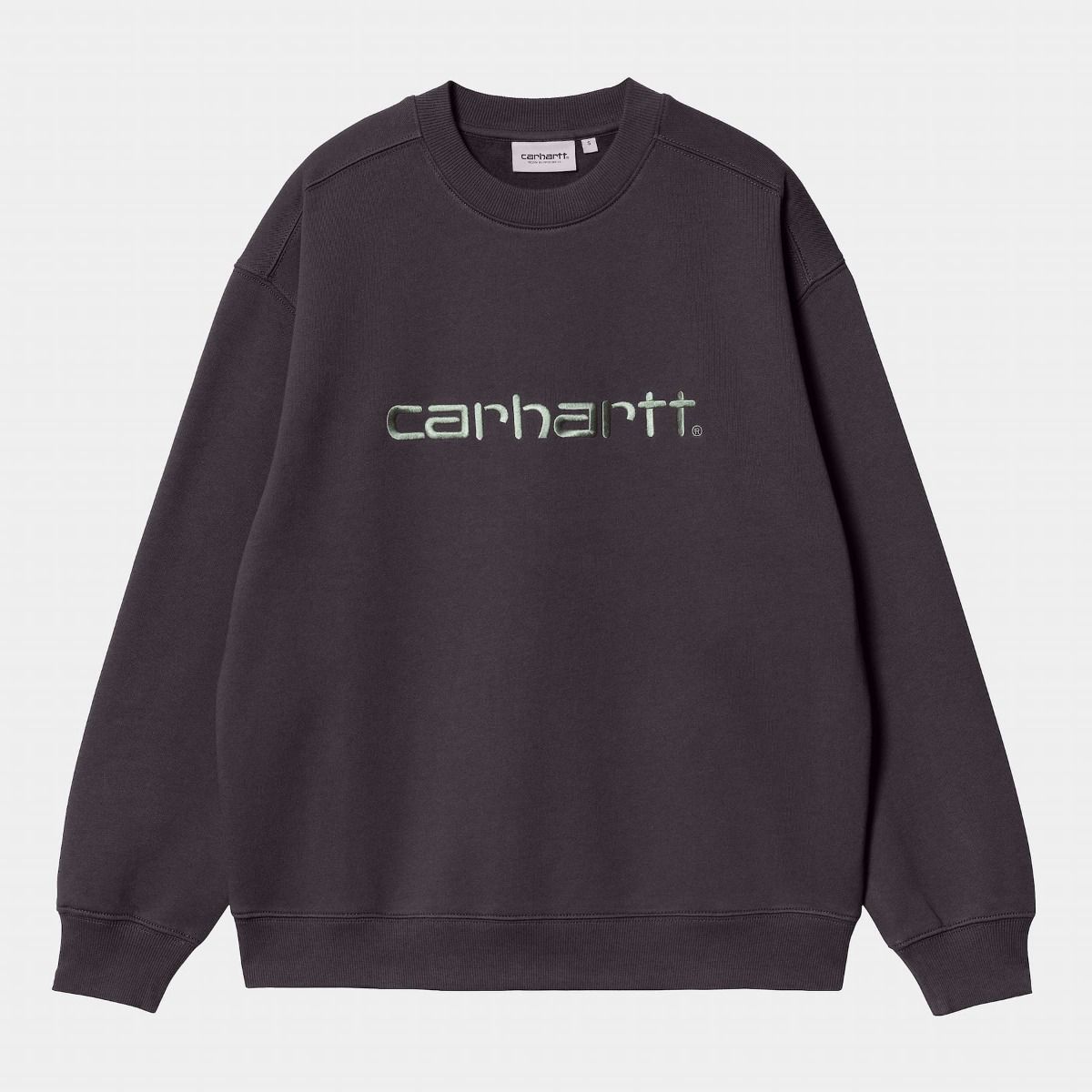 La Women's Carhartt Sweatshirt de Carhartt WIP está disponible en color malva con el logo bordado en verde (Artichoke/Misty Sage).