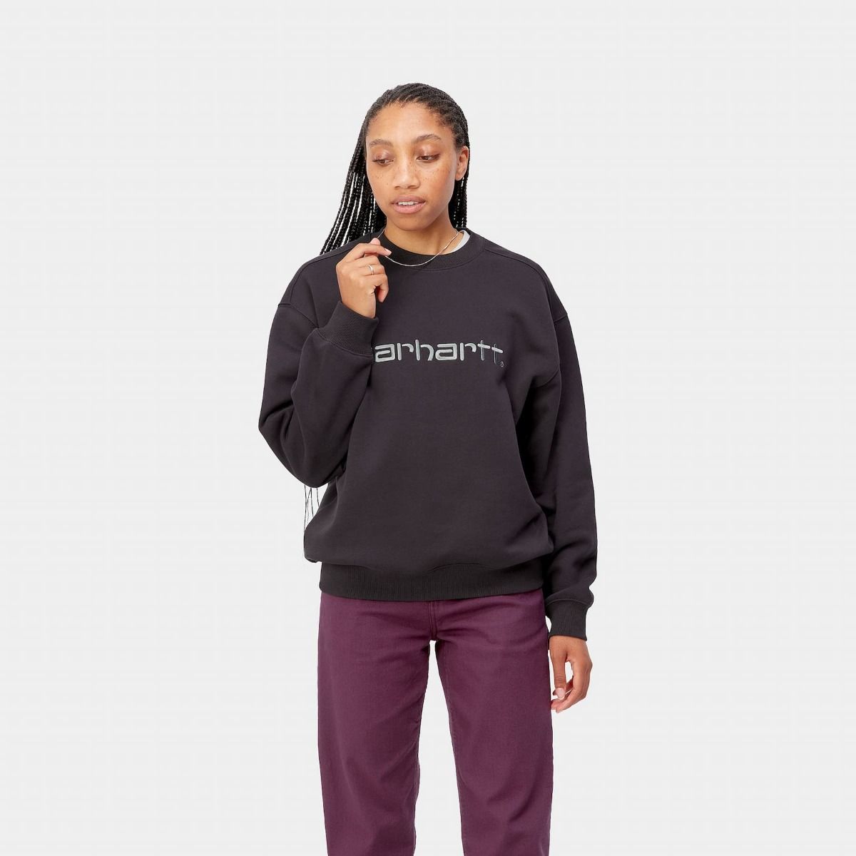 Esta sudadera para mujer de ajuste holgado cuenta con tejido peinado para proporcionar mayor suavidad y calidez sin renunciar a la transpirabilidad, cuello redondo, puños y cintura acanalados, y el logo de Carhartt en texto bordado en el pecho.