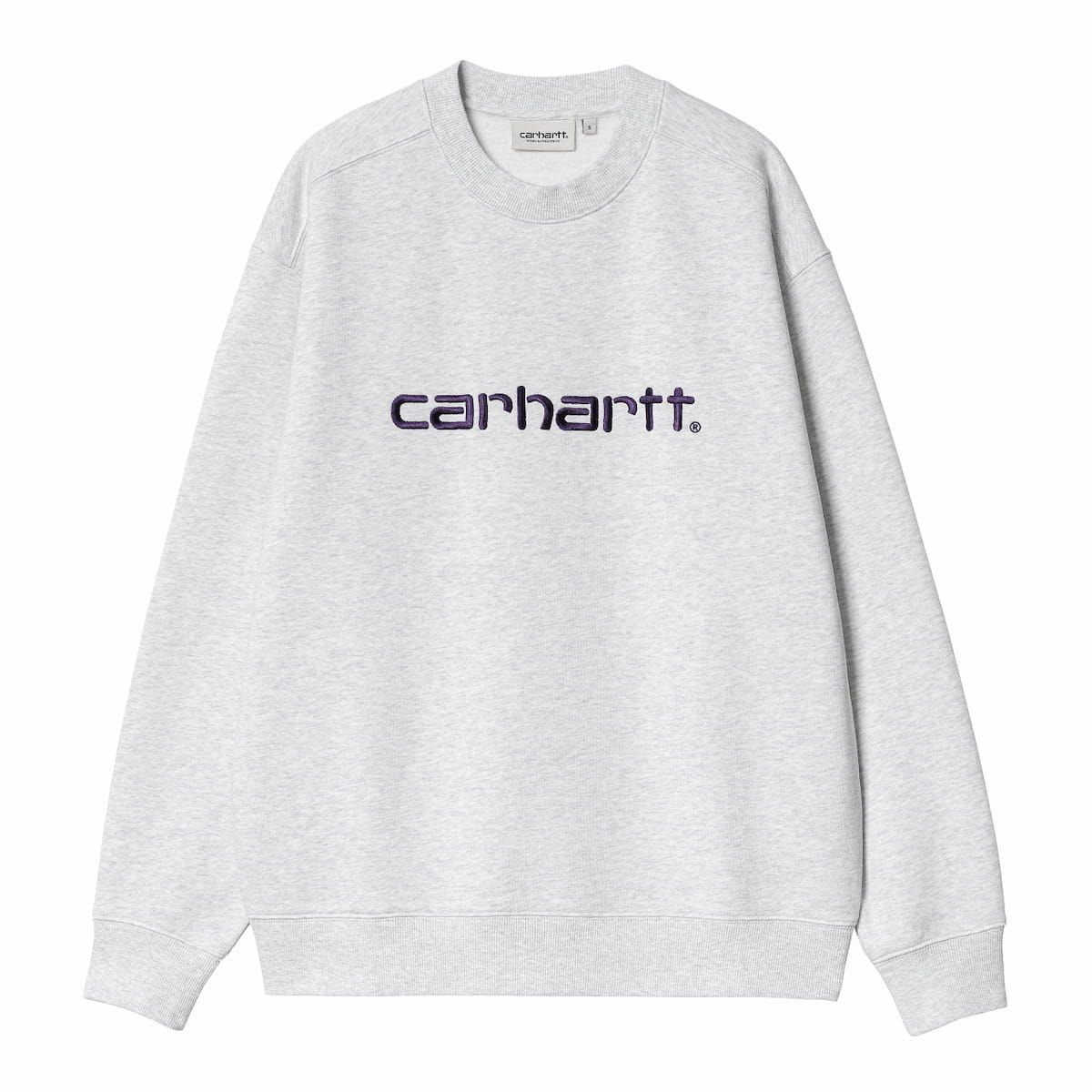 La sudadera para mujer W' Carhartt Sweat en tono gris ceniza jaspeado con el logo en lila (Ash Heather-Tyrian) de Carhartt WIP está confeccionada con punto grueso en mezcla de 74% algodón y 26% poliéster cepillado (340g/sqm).