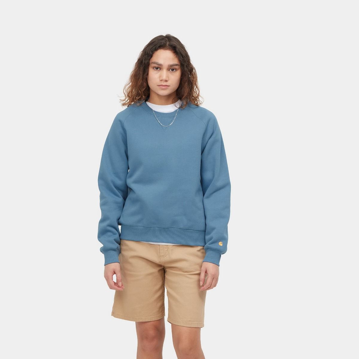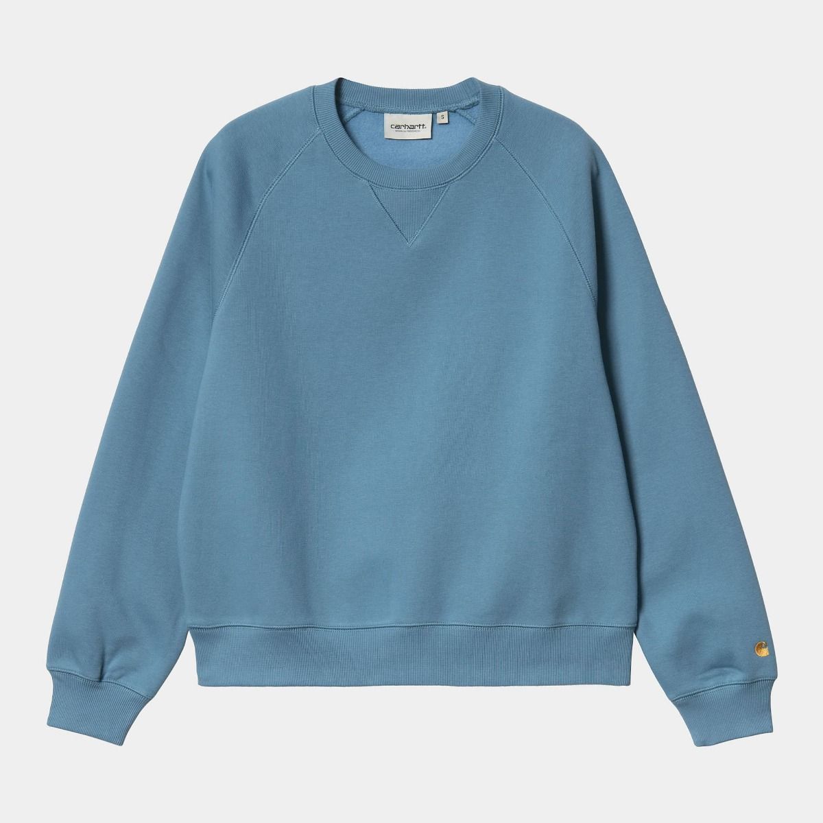 La Women's Chase Sweatshirt de Carhartt WIP está disponible en color azul (Icy Water-Gold).