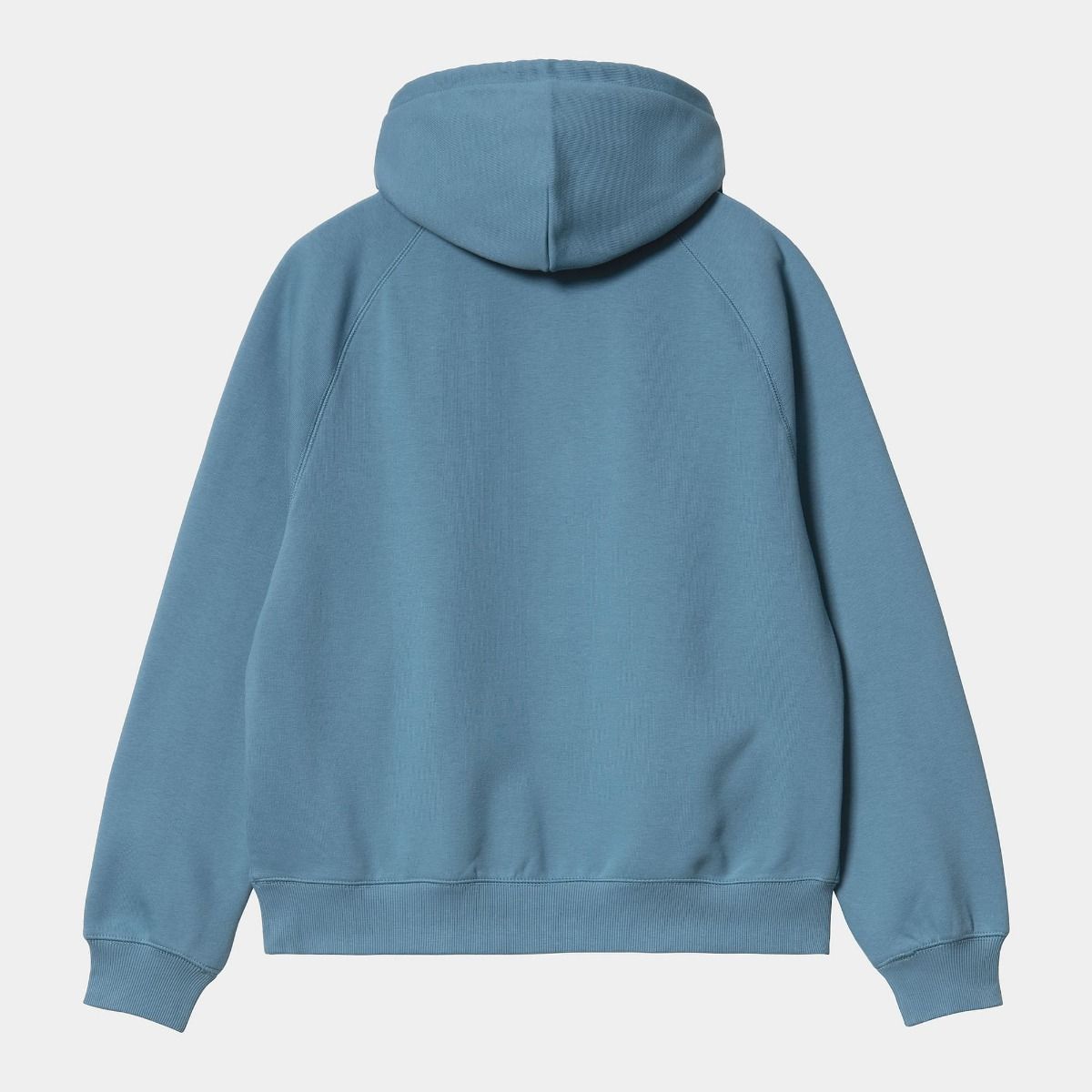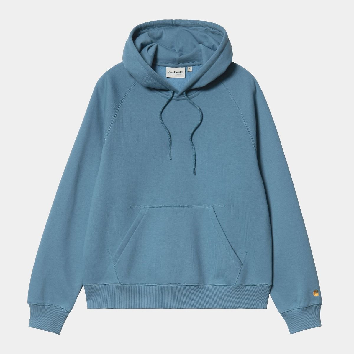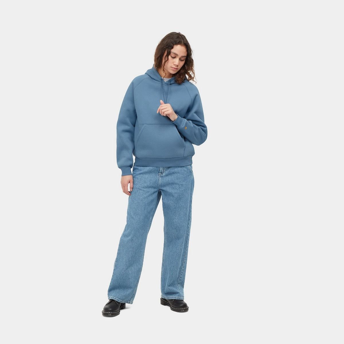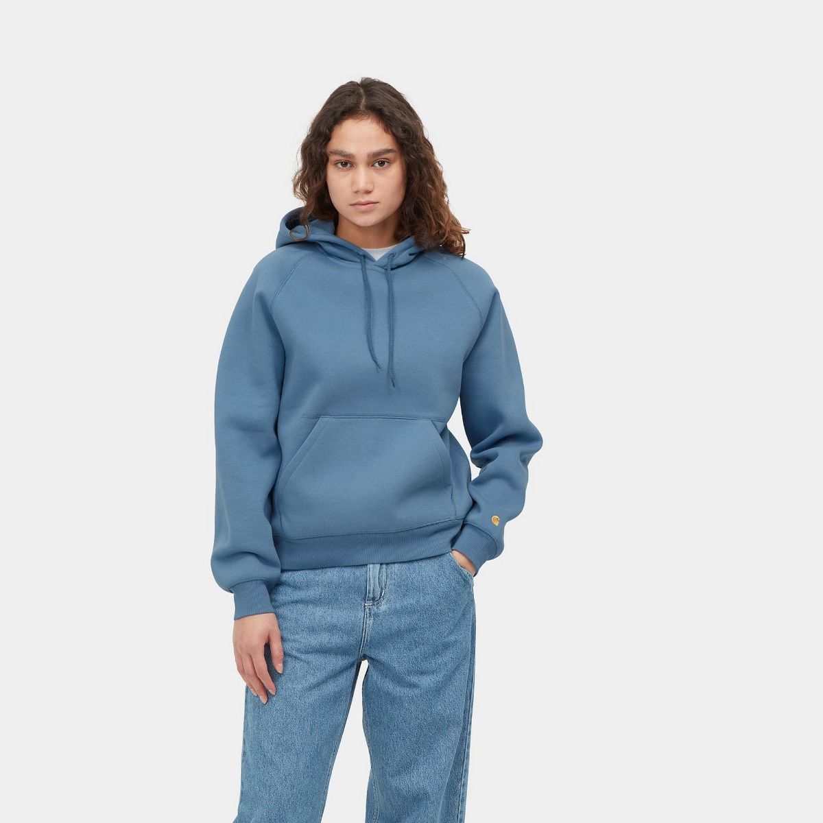La Women's Hooded Chase Sweatshirt de Carhartt WIP está disponible en color azul con el logo de Carhartt en dorado (Icy Water-Gold).