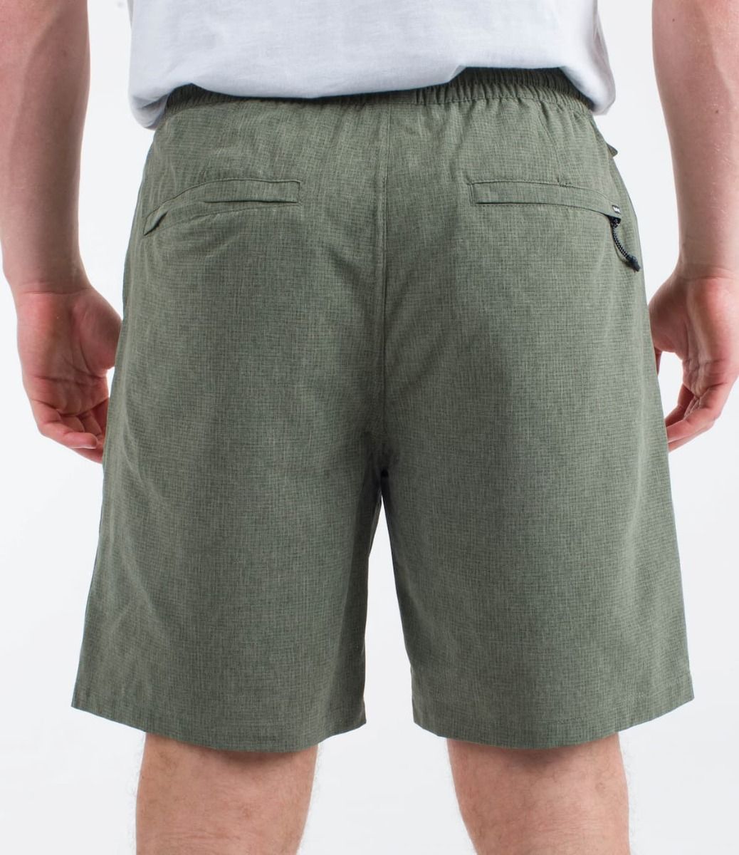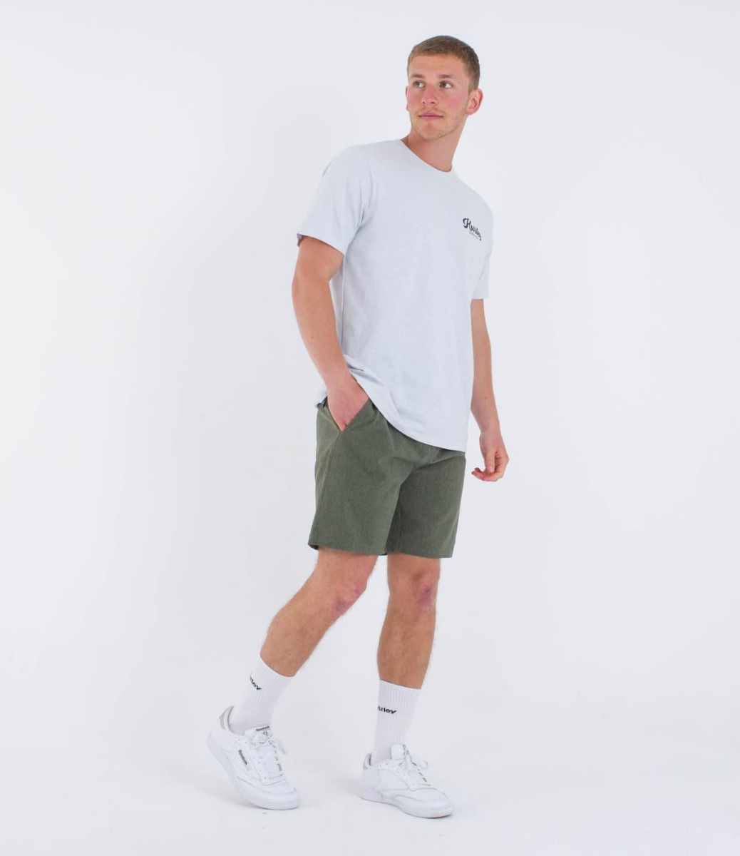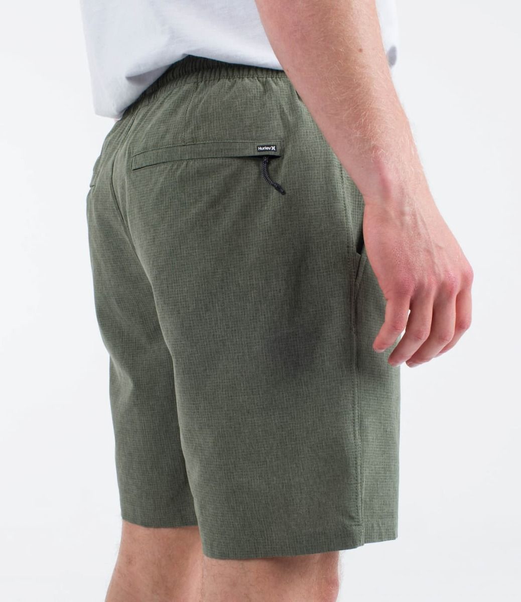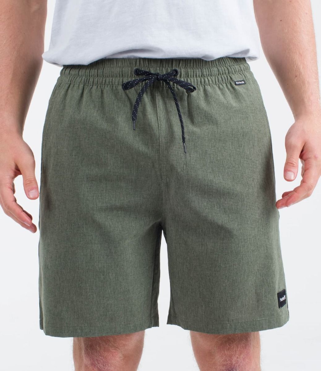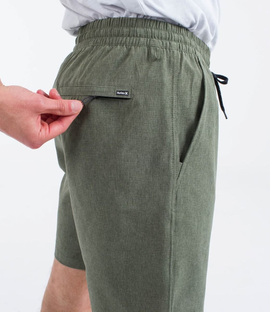 Las bermudas híbridas para hombre Phantom Flow Volley 18" Walkshort en tono verde helecho (Chacoal Fern) de Hurley, diseñadas para llevar tanto dentro como fuera del agua, están confeccionadas con tejido Phantom elástico en 4 direcciones perforado y con revestimiento DWR que te proporcionará movilidad, transpirabilidad y secado rápido (45% poliéster reciclado, 45% poliéster y 10% elastán).