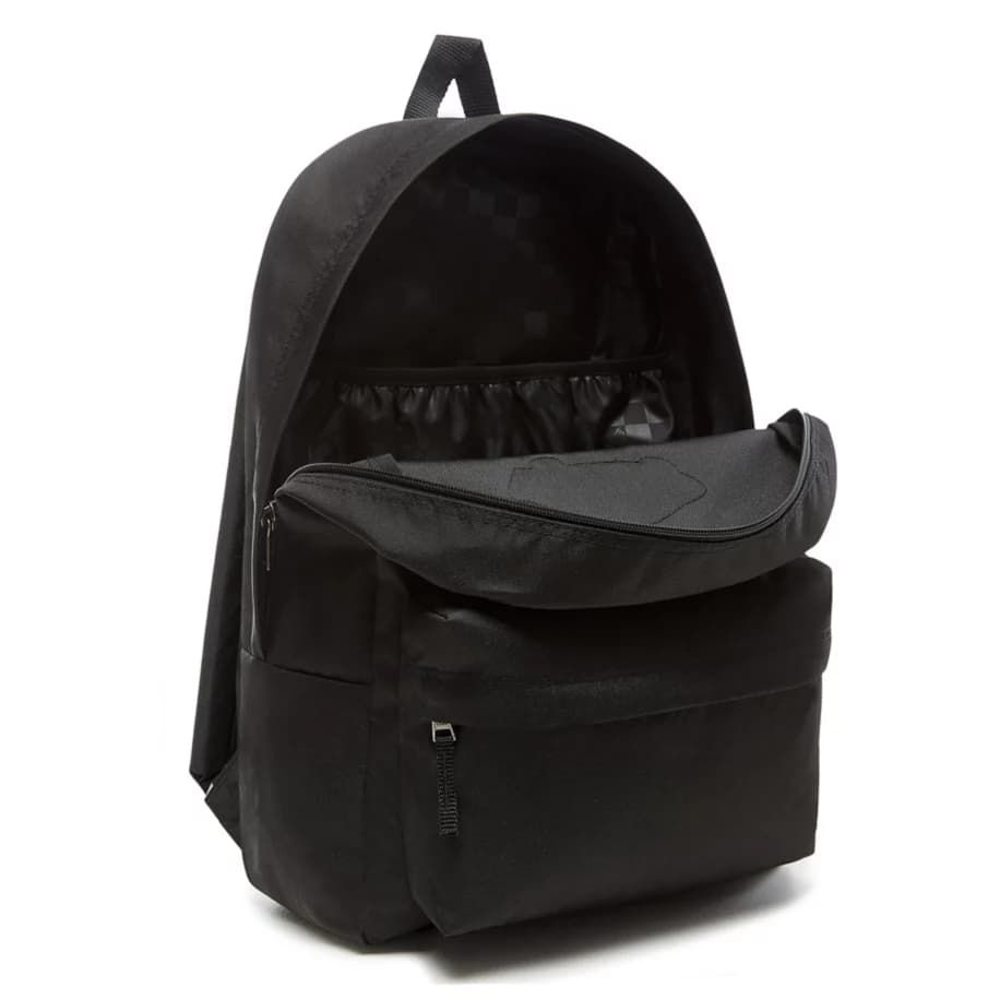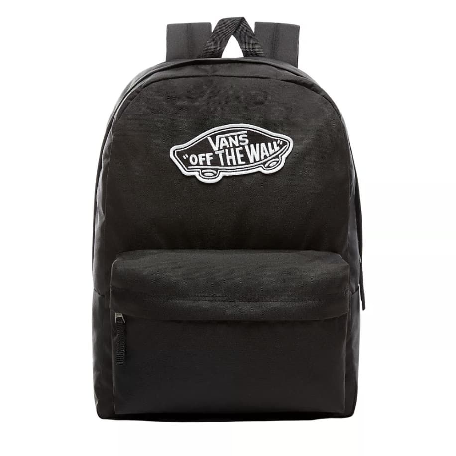 Esta práctica mochila escolar de estilo clásico en color negro cuenta con dos bolsillos de forro repujado en el panel interior trasero, un amplio compartimento principal con cremallera para organizar cómodamente tus objetos de uso diario, una funda interior para portátiles de hasta 15 pulgadas, un bolsillo delantero con compartimento organizador, correas de hombro ajustables y acolchadas de corte recto, el emblemático parche con el logotipo del skate «Off The Wall» tejido en el frontal y una etiqueta de garantía Vans cosida en la correa izquierda y en el interior.