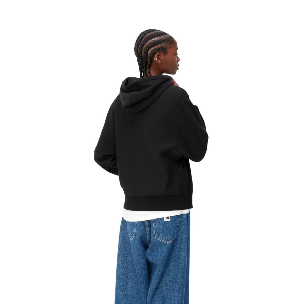 Este hoodie negro para mujer de corte cuadrado (boxy) cuenta con tejido cepillado para proporcionar un aspecto de forro polar, lavado en prenda para mayor suavidad, capucha ajustable mediante cordón, bolsillo delantero tipo canguro, puños y cintura de canalé, junto con bordado americano del logo de Carhartt WIP en dos tonos en el lado izquierdo del pecho.
