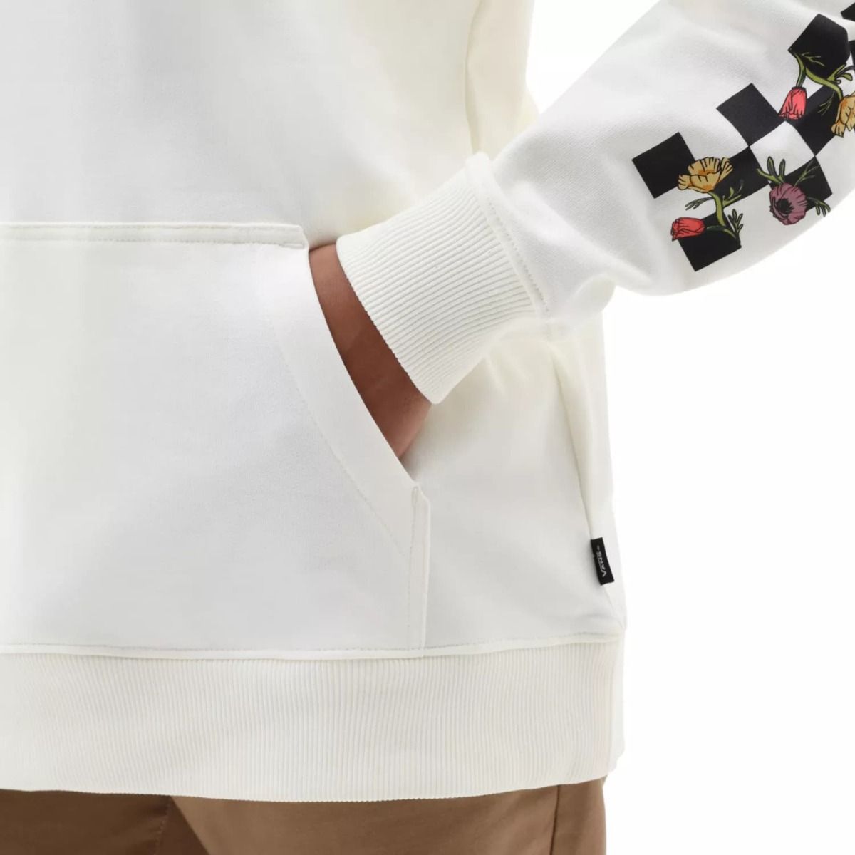 Este cómodo hoodie de corte boyfriend cuenta con capucha ajustable mediante cordón, un amplio bolsillo tipo canguro, estampado checkerboard floral en las dos mangas y el logo de Vans con motivos florales serigrafiado en la parte delantera.