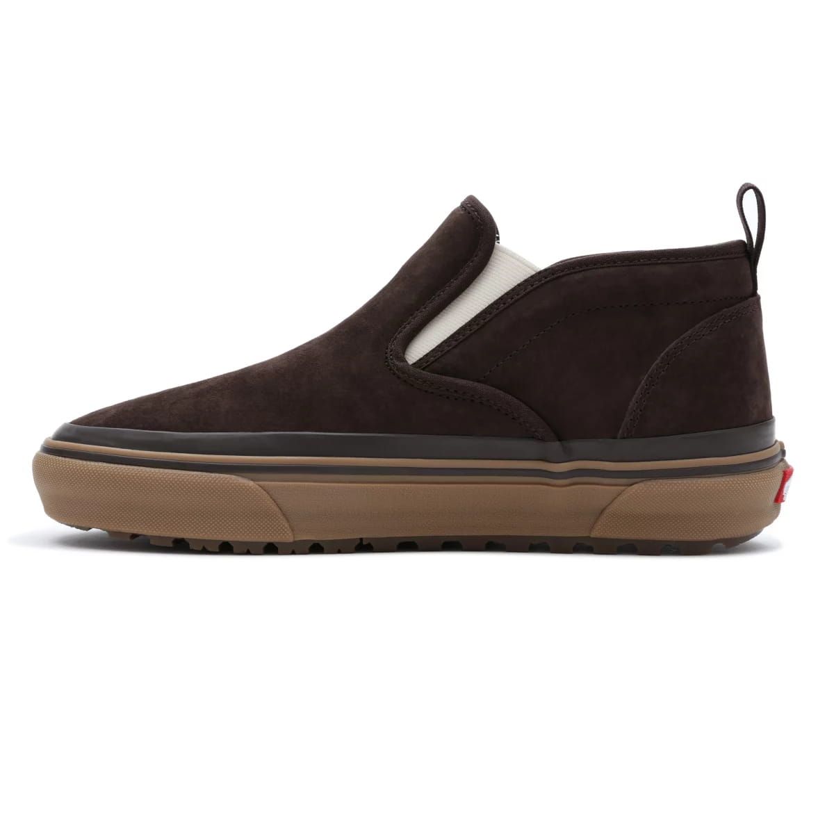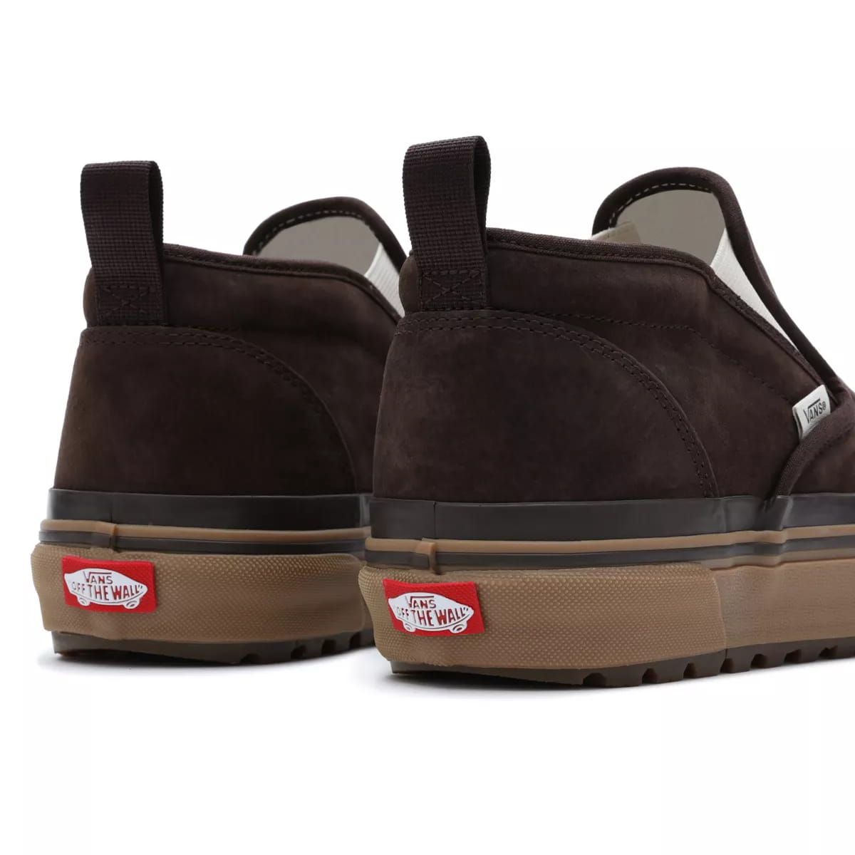 Las Zapatillas sin cordones Mid Slip MTE-1 color marrón y goma para hombre tienen una etiqueta de garantía Vans® cosida en el lateral.