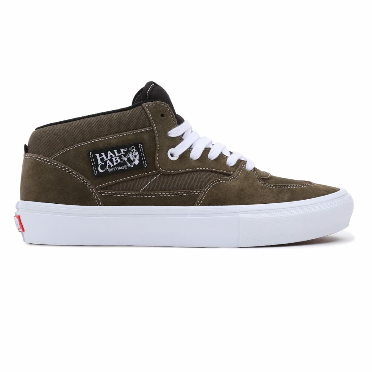 Las zapatillas de skate para hombre Half Cab en verde oliva oscuro (Dark Olive) de Vans están confeccionadas con tejido ultra resistente de ante y lona.
