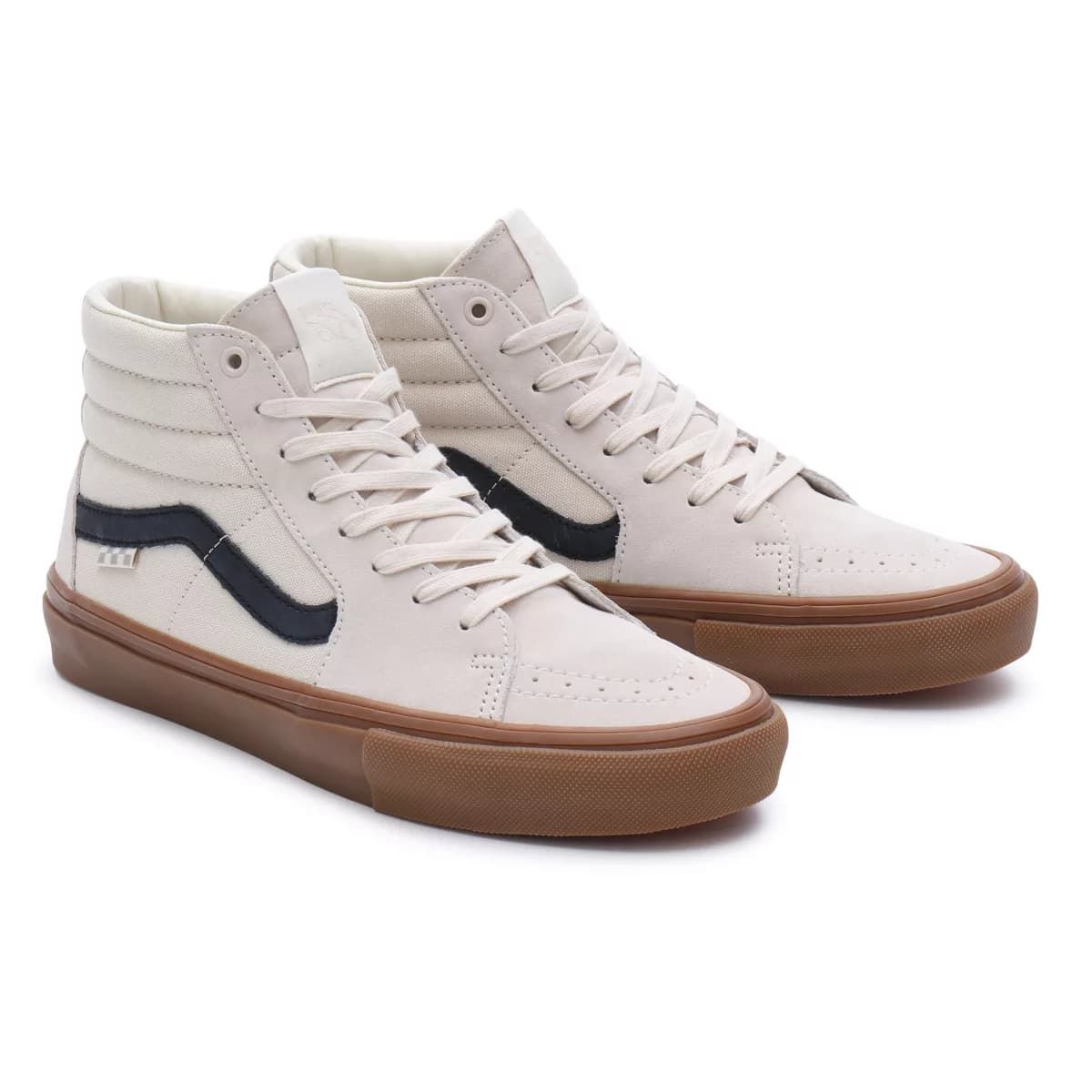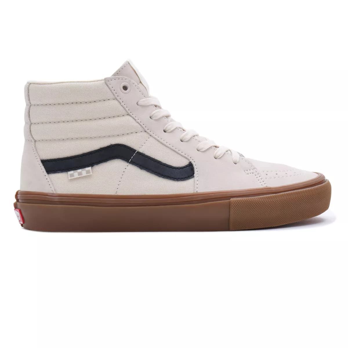 Las zapatillas de skate para hombre Sk8-Hi de Vans en color beige y goma (Birch-Gum) con la banda lateral Sidestripe en negro están confeccionadas con un tejido ultra resistente de ante, lona y goma.