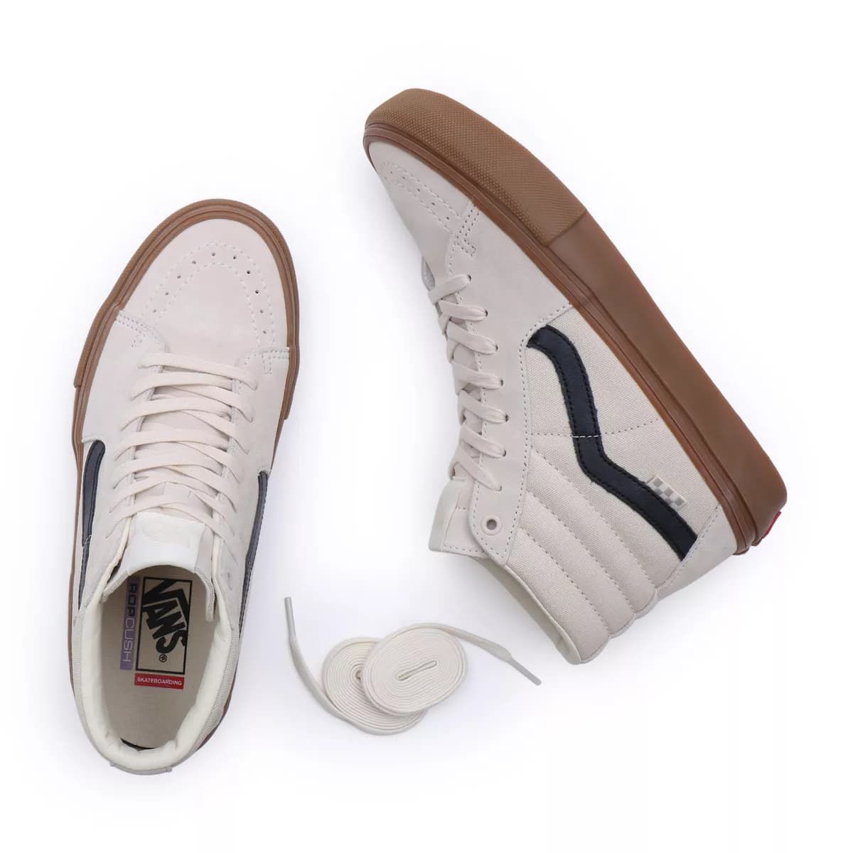 Además, estas Sk8-Hi color Birch-Gum incorporan una banda protectora doble de goma dividida en dos partes, un refuerzo en la puntera de textura más profunda para un mayor contacto con tu tabla de skate, paneles laterales más altos para una durabilidad óptima, la distintiva suela waffle de Vans mejorada con compuesto de goma SickStick™ que te proporciona un agarre más firme, la plantilla PopCush™ con un excelente retorno de energía que se adapta al usuario y su manera de moverse sobre el monopatín para una amortiguación y protección contra impactos magnífica, a la vez que reduce el cansancio en las piernas y refuerzos internos en el talón para mayor sujeción y estabilidad.