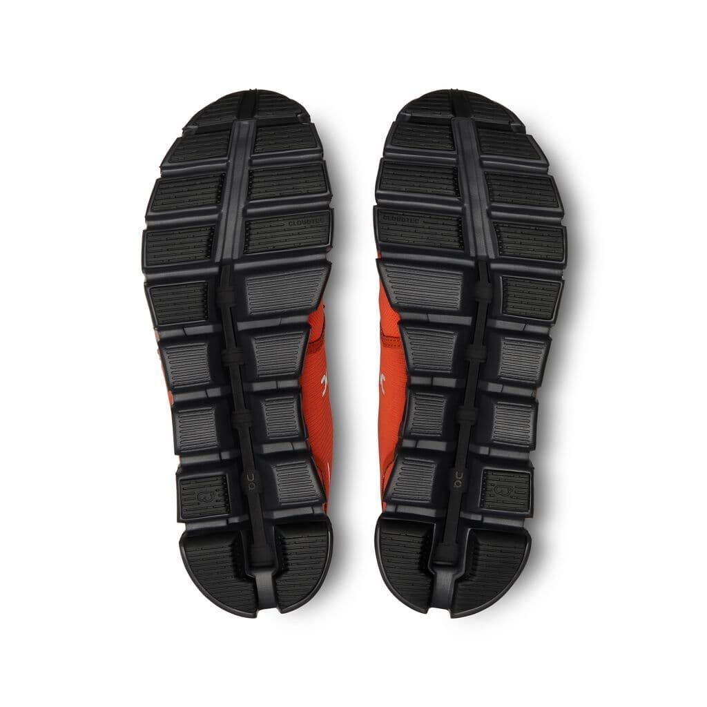 Las zapatillas para hombre Cloud 5 Waterproof en naranja con detalles en gris (Flame-Eclipse) de On Running te proporcionan la protección que necesitas en días de viento y lluvia.