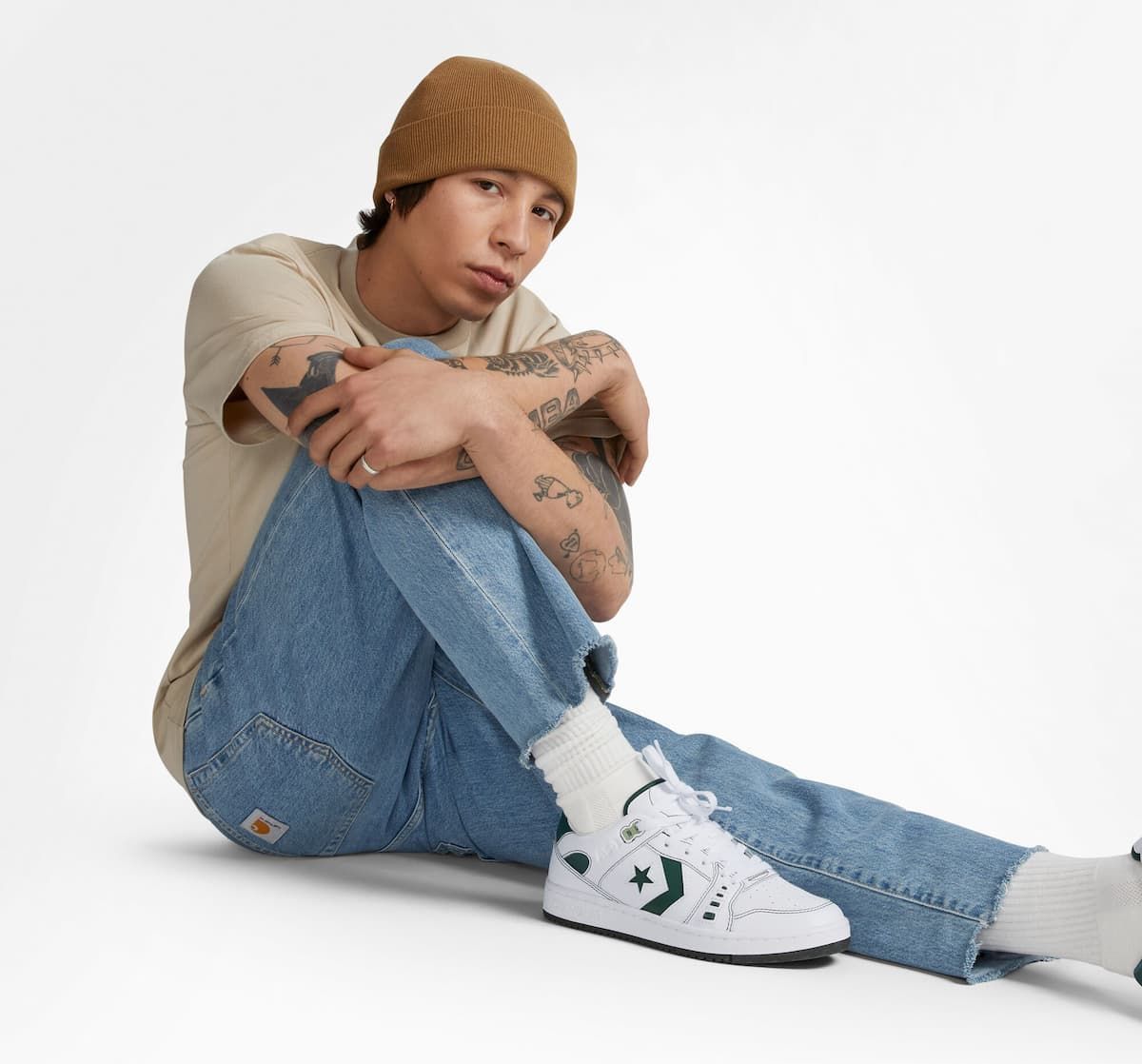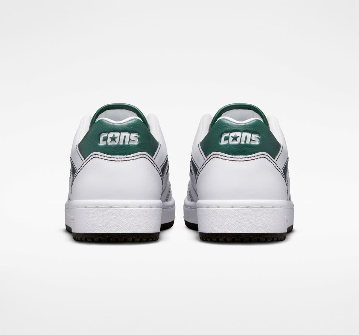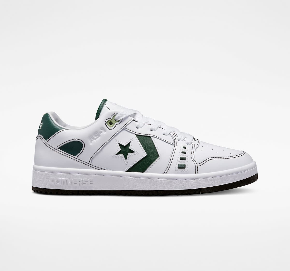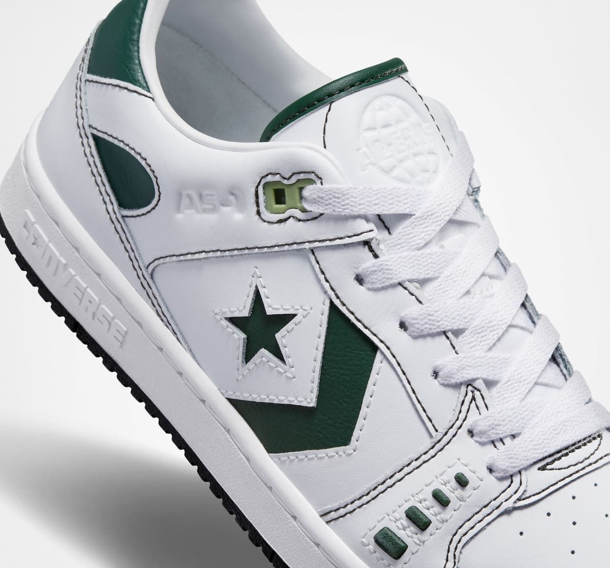 Las Converse CONS AS-1 Pro blancas y verdes cuentan con diseño cupsole con núcleo perfeccionado integrado, un perfil bajo para una flexibilidad máxima, parte superior de piel, almohadillas de goma visibles en la parte superior para mayor durabilidad, cordones planos blancos de algodón, plantilla de espuma CX para mayor amortiguación y protección contra impactos, suela exterior de goma con patrón de espiga para una tracción y agarre óptimos, el icónico logo de estrella y galón de piel en el lateral, grabado Alexis Sablone en relieve en la lengüeta y el logo de CONS estampado en el talón.