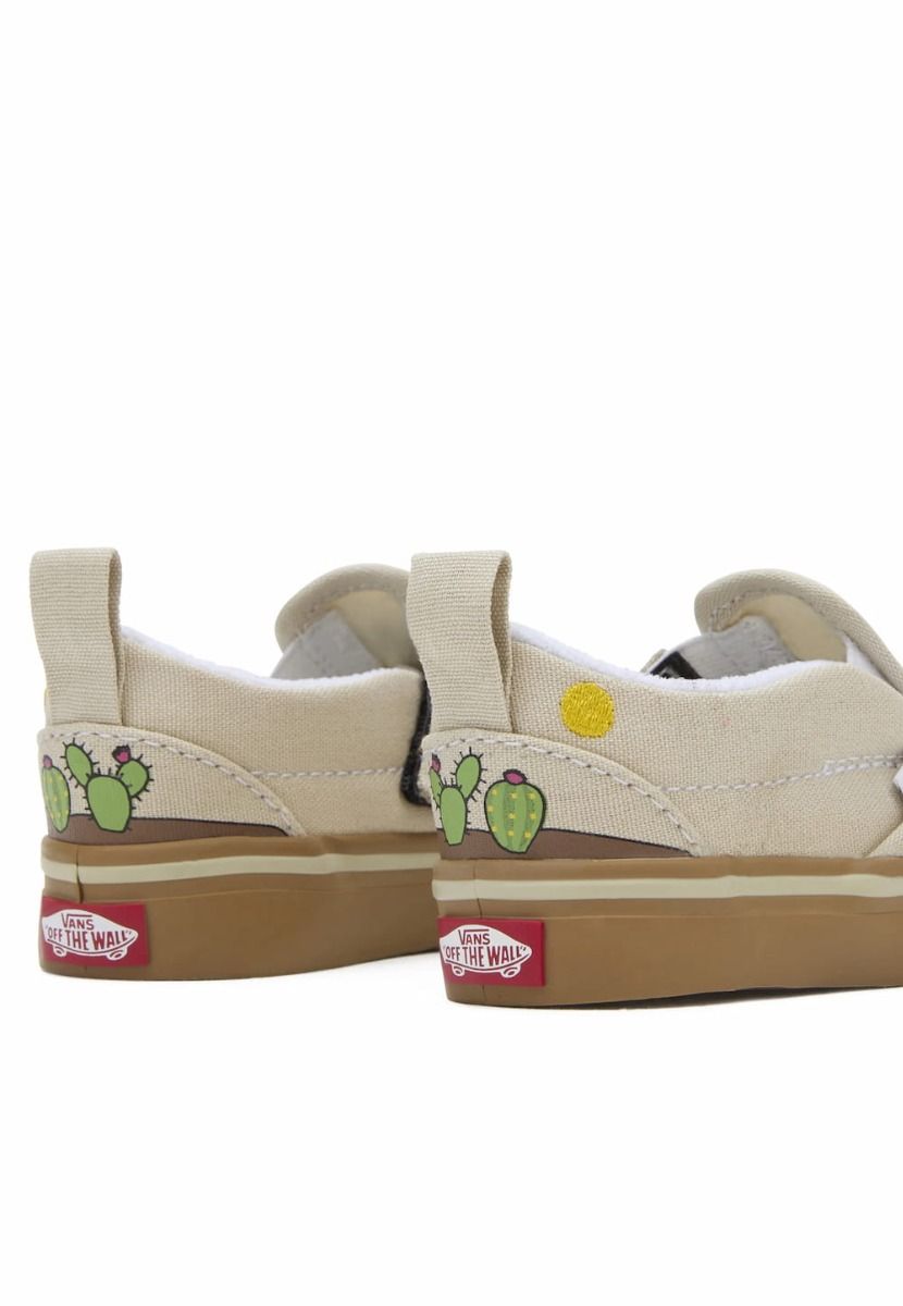 Las Zapatillas para bebé Slip-On V Cactus de Vans en tono beige con bordados de cactus (Cactus Ranch Green) han sido fabricadas con ante, lona y caucho.