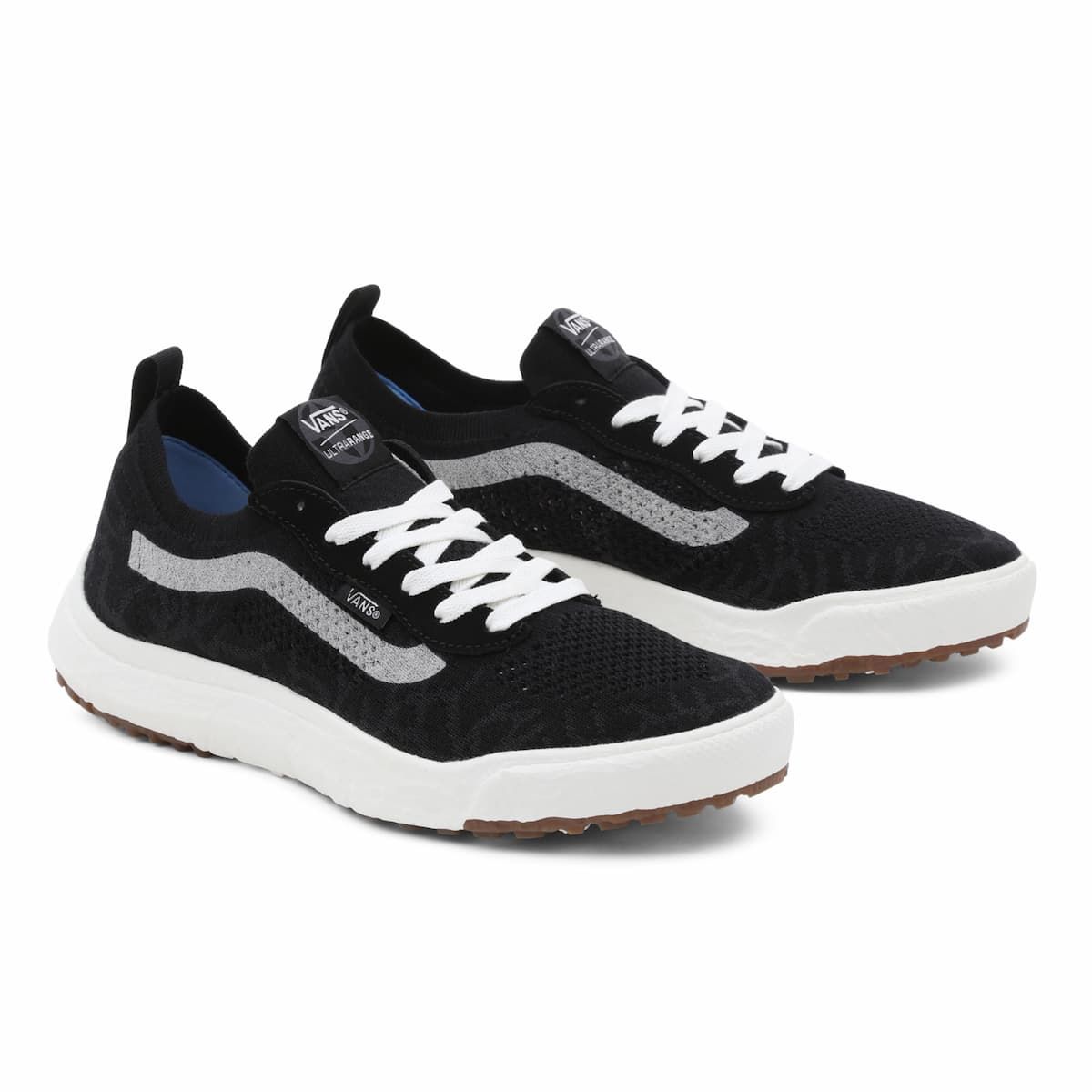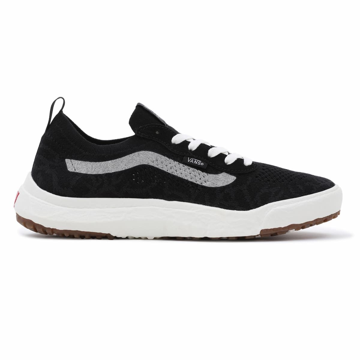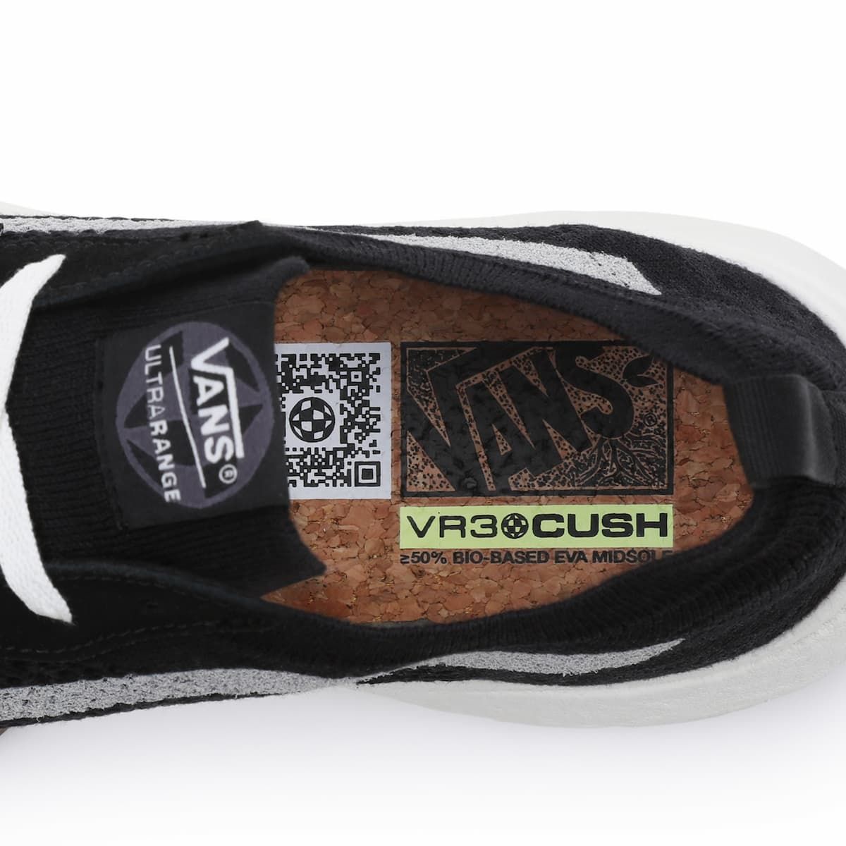 Las zapatillas ecológicas UltraRange VR3 negras y blancas para hombre tienen una etiqueta de garantía Vans® cosida en la lengüeta.