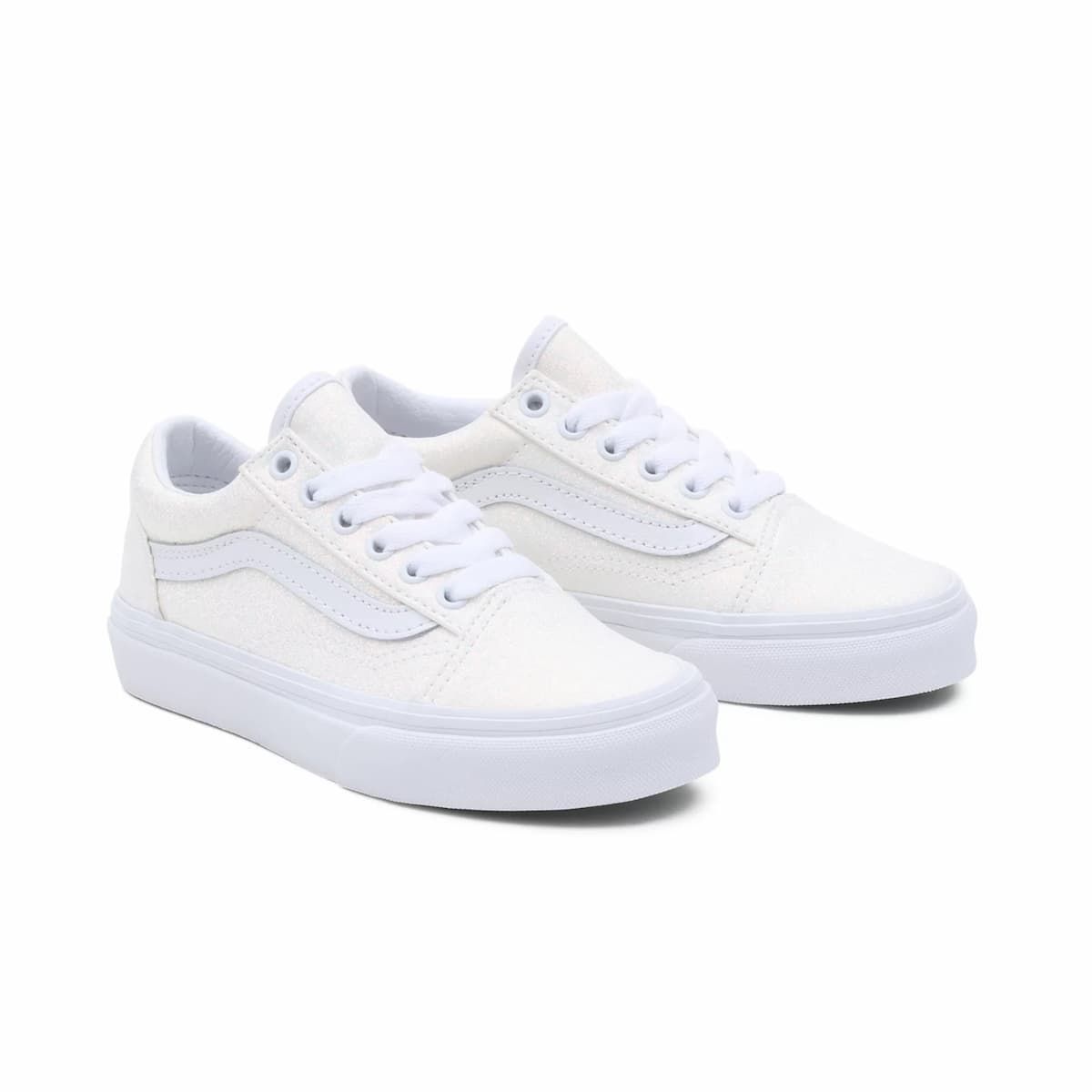 Las zapatillas para niños y niñas de entre 4 y 8 años UY Old Skool Glitter de Vans en blanco con purpurina (Glitter White) están confeccionadas con ante y lona.