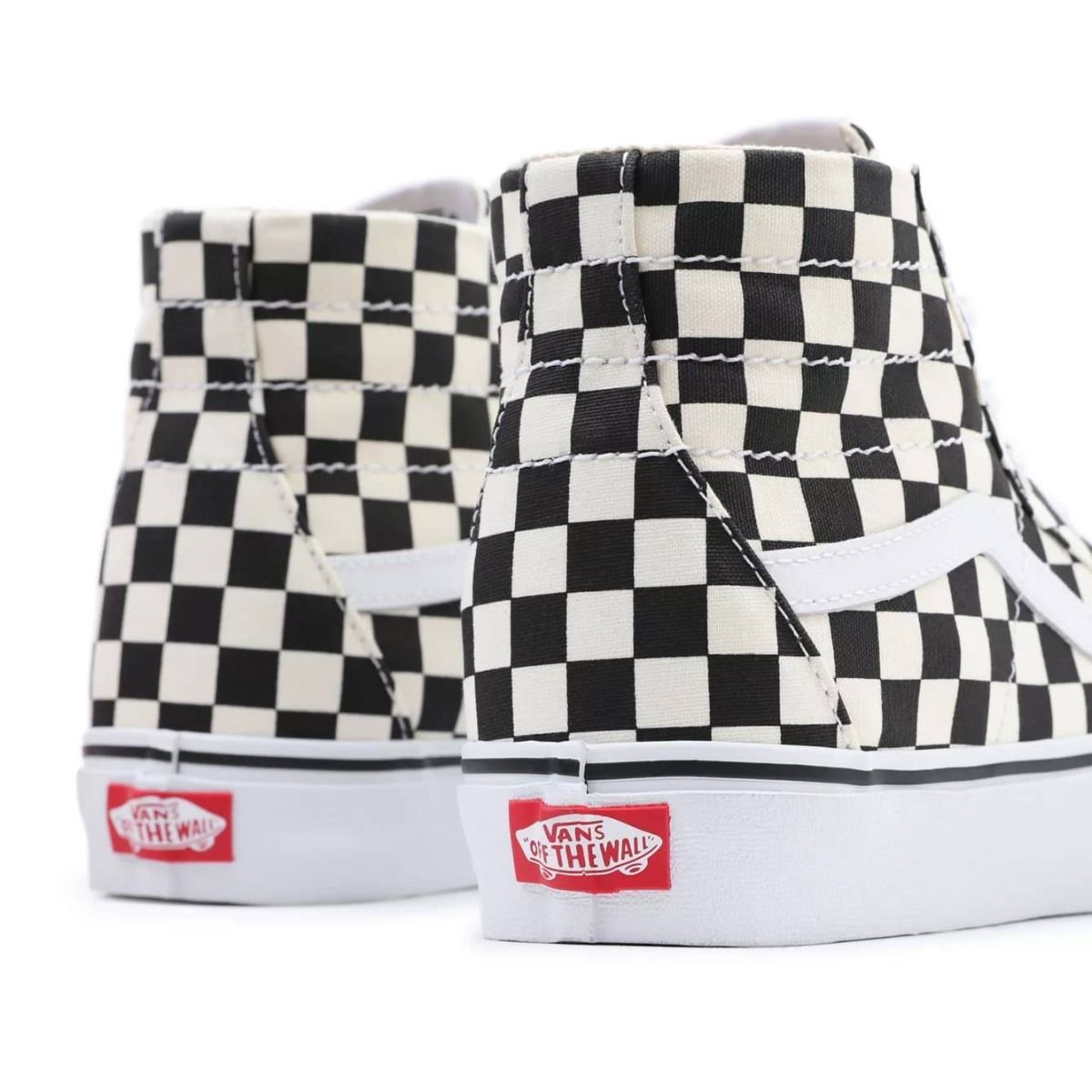 Las zapatillas de caña alta SK8-HI de Vans en color negro con estampado Checkerboard y la banda lateral en blanco tienen una etiqueta de garantía Vans cosida en la lengueta.
