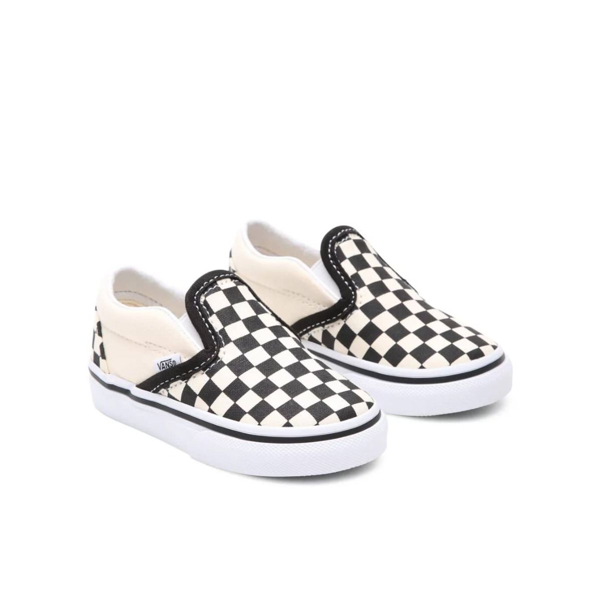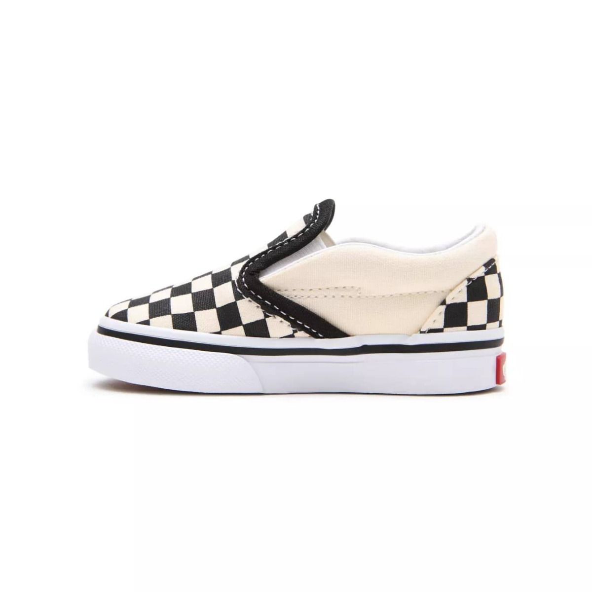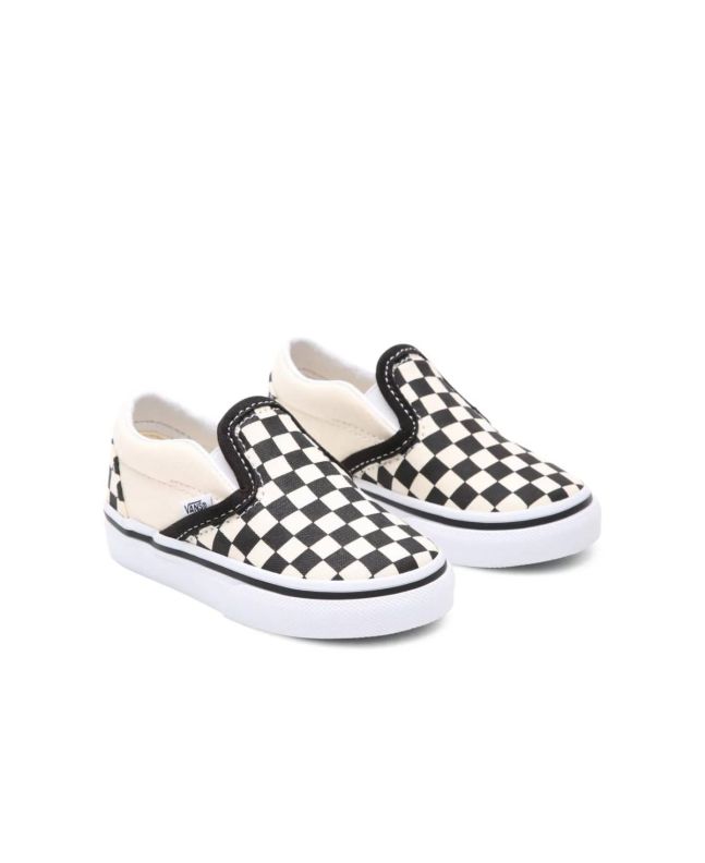 Las deportivas infantiles Vans Toddler Classic Slip-On Checkerboard con estampado damero en color negro y blanco (Blk&Whtchckerboard/Wht) son el calzado perfecto para los más pequeños. Diseñadas sin cordones, con paneles elásticos laterales y un cuello acolchado, garantizan un ajuste cómodo y seguro para bebés y niños/as de hasta 4 años.