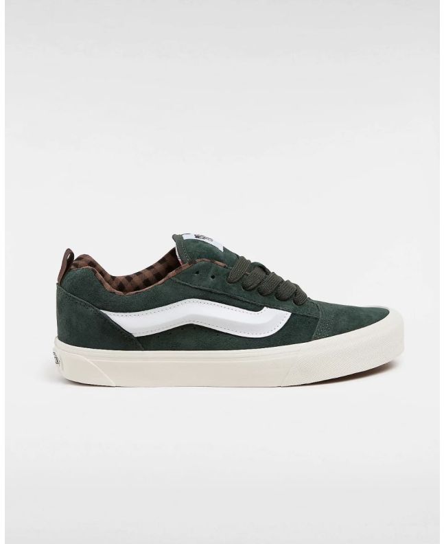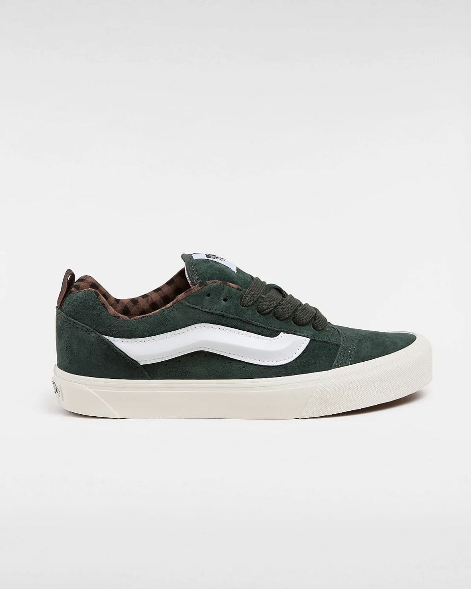 Las Zapatillas para hombre Knu Skool Pig Suede en tono verde con interior a cuadros (Plaid Scarab) de Vans son una reimaginación moderna de un clásico de los años 90, diseñadas para quienes buscan un estilo audaz y funcionalidad en cada paso. Inspiradas en la época dorada del skate, cuando las zapatillas de skate destacaban por su extra de acolchado, estas Knu Skool reeditadas mantienen la esencia "Off The Wall" de Vans con un toque moderno y atrevido.