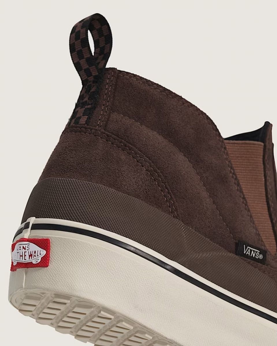 Zapatillas Vans MTE Mid-Slip Insulated marrones, impermeables y cálidas. Diseño slip-on con aislamiento térmico y suela regenerativa, perfectas para el frío.