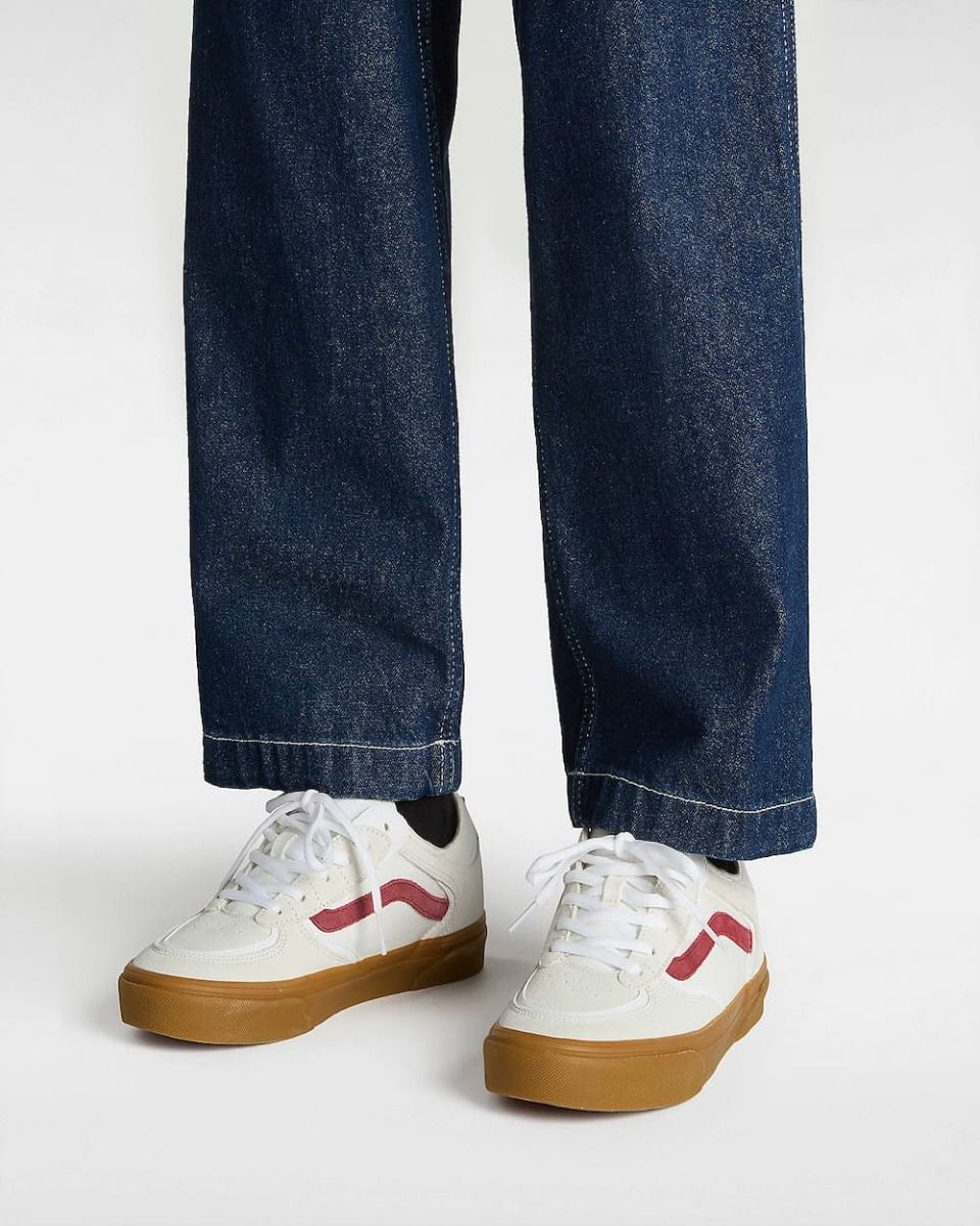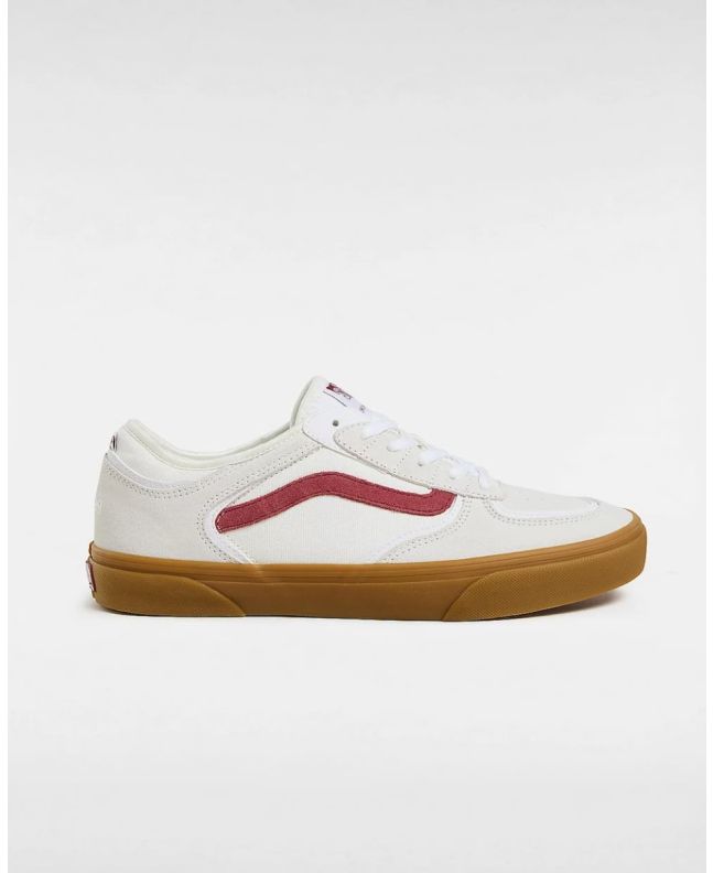 Las deportivas para hombre Vans Skate Rowley en tono blanco y goma con la banda lateral en rojo (Red-White-Gum) son un homenaje al icónico skater Geoff Rowley, celebrando 25 años de historia y evolución en el skateboarding.