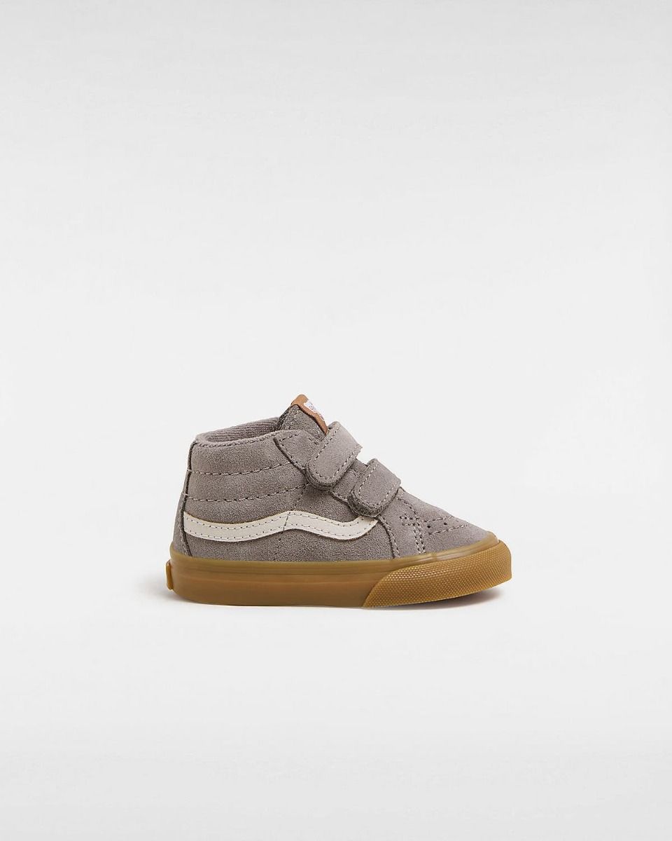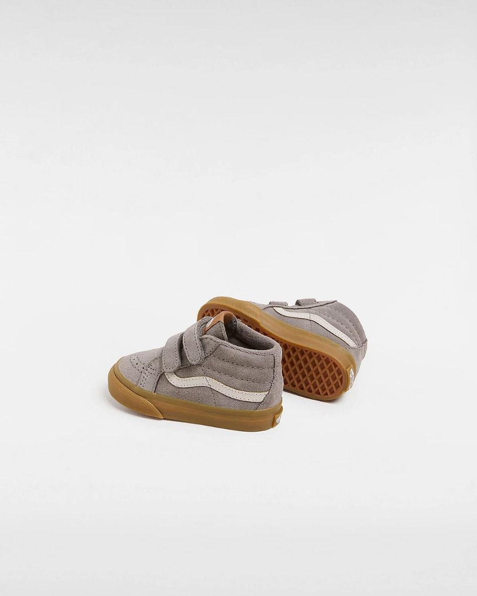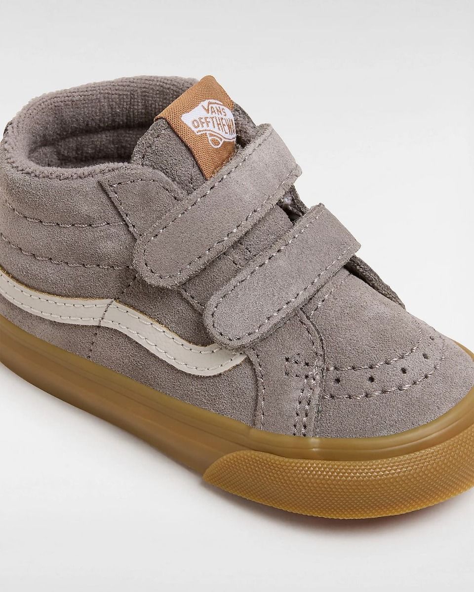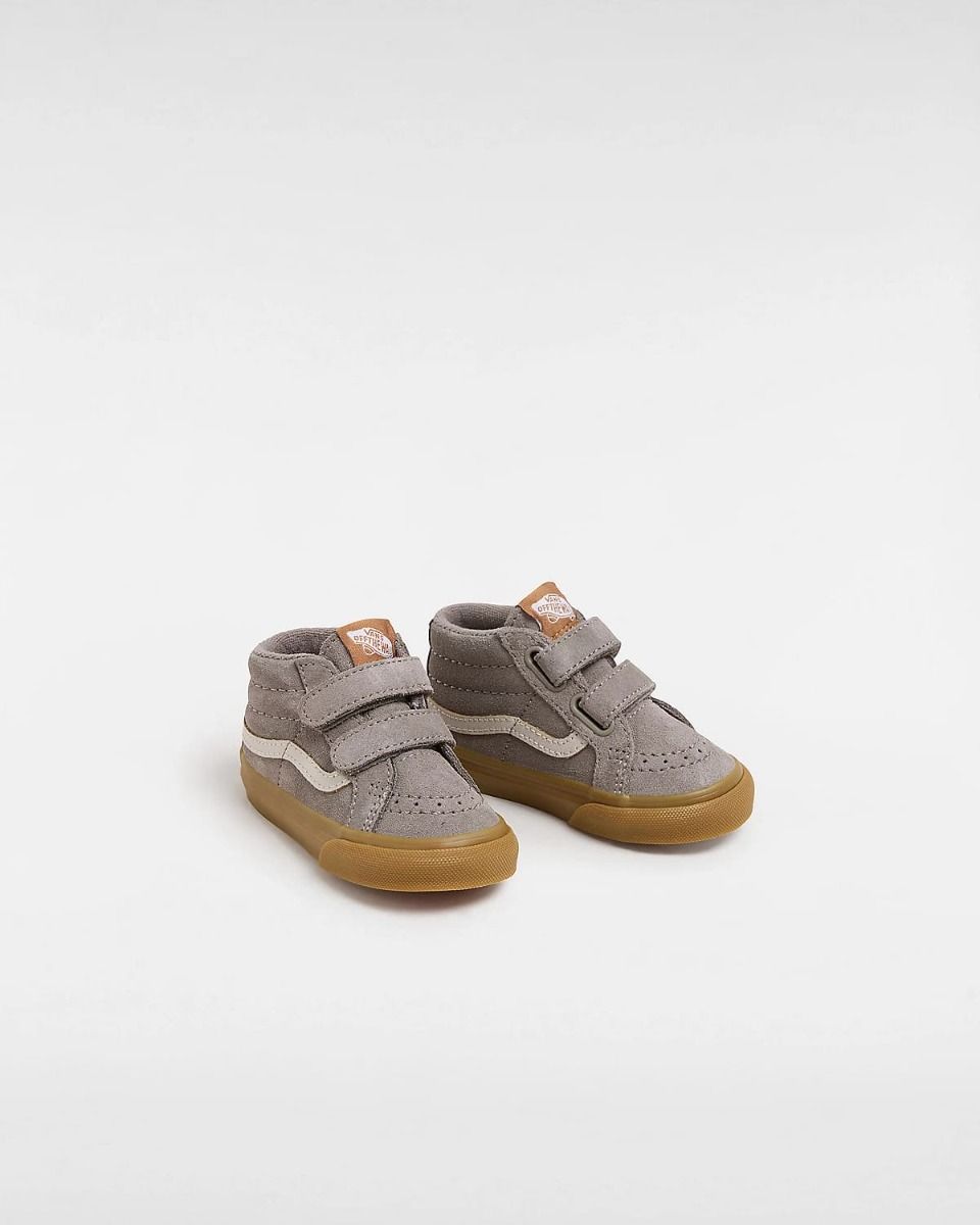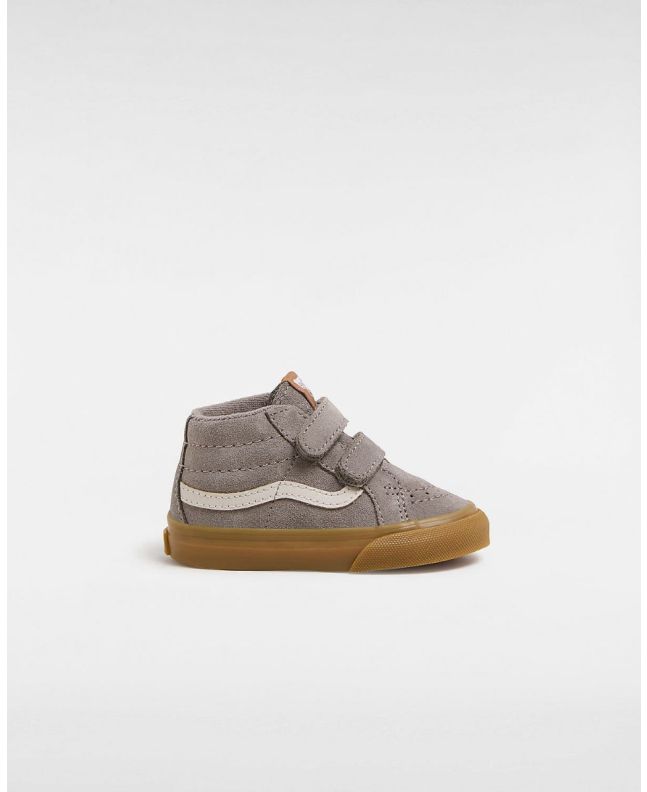 Las deportivas Vans Toddler Sk8-Mid Reissue V en tono gris y goma (Grey-Gum) son una versión reinventada para niños de 1 a 4 años del icónico modelo Sk8-Hi®, adaptadas en un cómodo diseño de media caña y cierre adherente para una puesta fácil y rápida.
