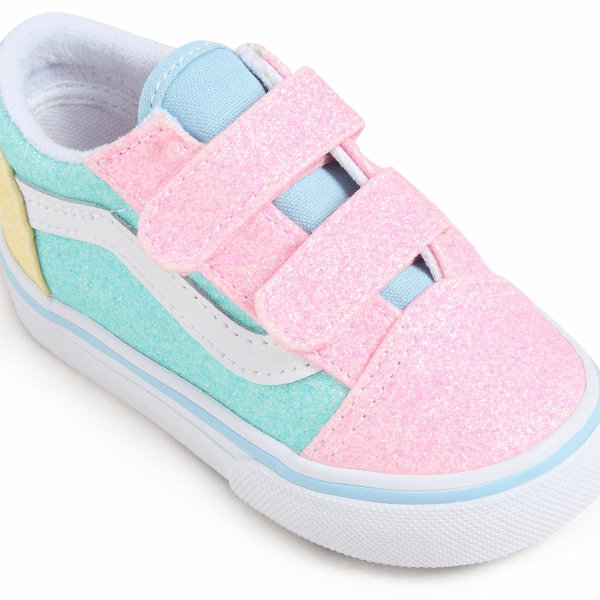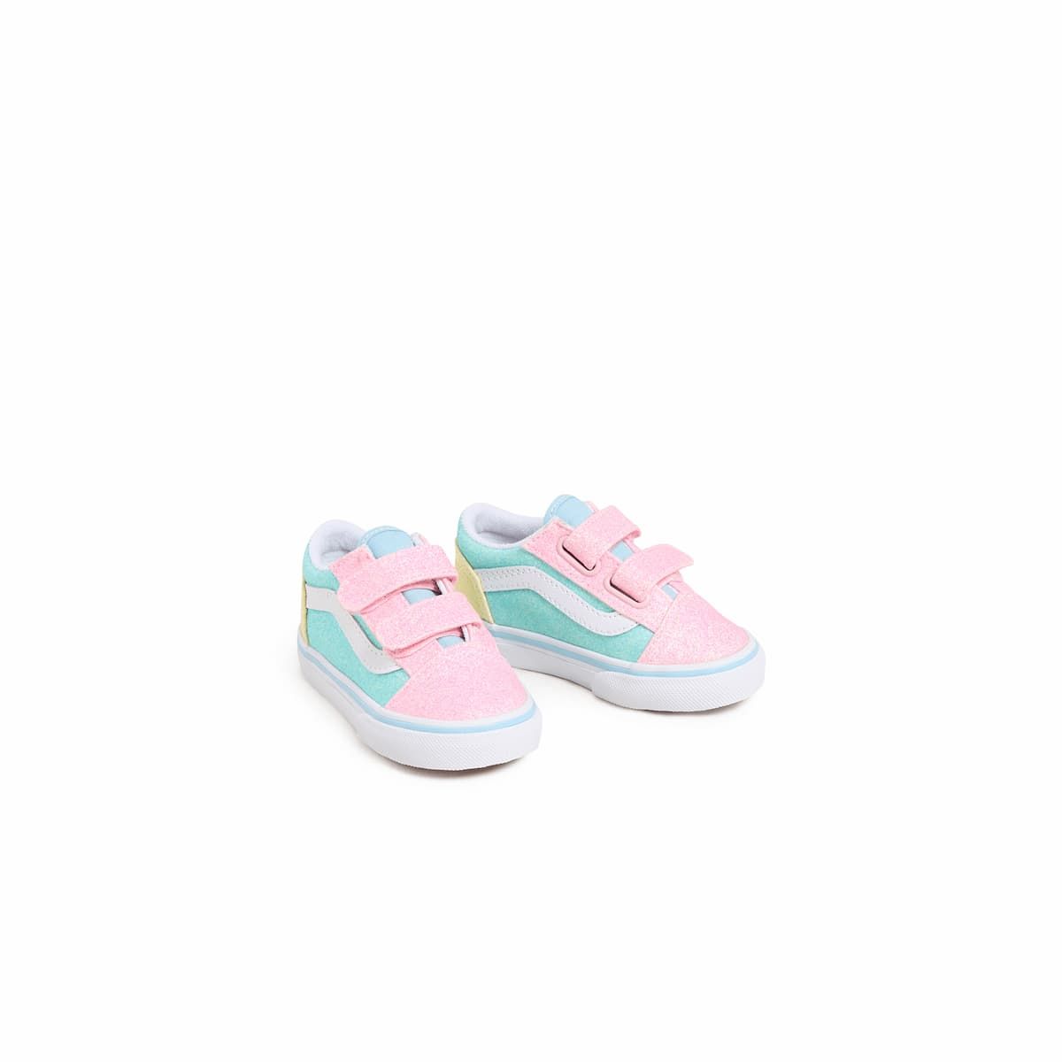 Las deportivas con cierre adherente Vans TD Old Skool V Pastel Glitter en tonos pastel multicolor (Pastel Multi) están diseñadas para que los más pequeños disfruten de cada paso con comodidad, seguridad y un toque de magia. Este modelo infantil combina el clásico diseño Old Skool de Vans con un acabado de purpurina alegre y llamativo, ideal para bebés de 1 a 4 años.