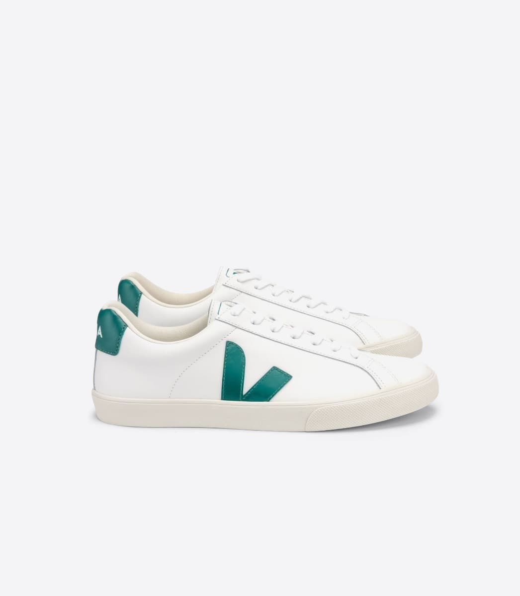 Las Veja Esplar White Brittany cuentan con paneles de cuero impermeable y repelente al agua, el característico logotipo cosido en contraste y forma de V de Veja en verde hecho de caucho y de residuos de arroz, y cordones de algodón 100% orgánico.