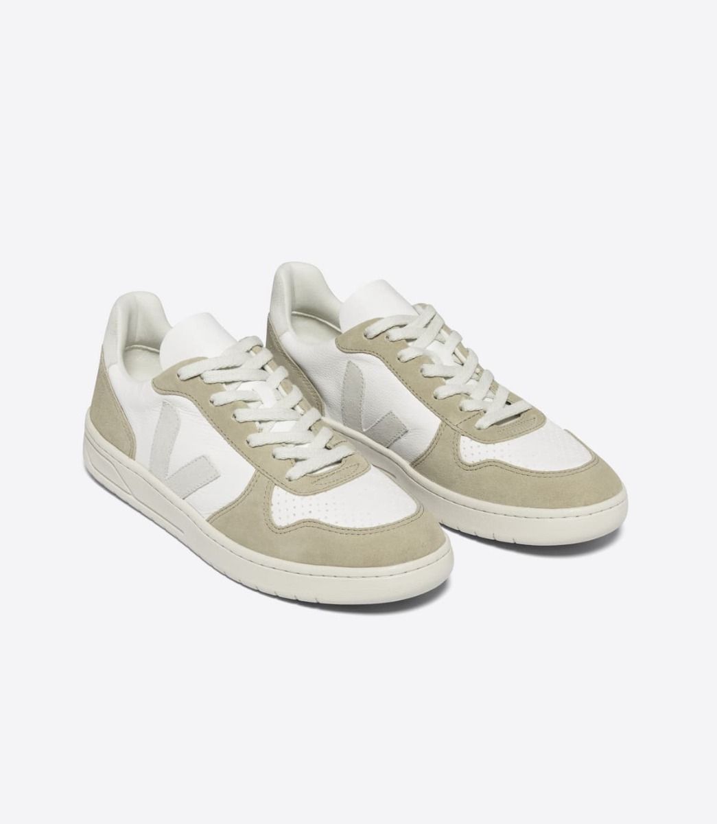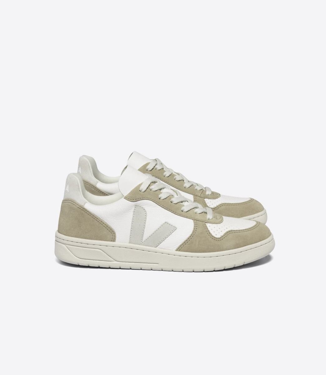 Las zapatillas para hombre y mujer V-10 Chromefree Leather en blanco con detalles en marrón y natural (White Natural Sahara) de Veja son un calzado deportivo cómodo, elegante y versátil que combina la moda sostenible y el estilo urbano.