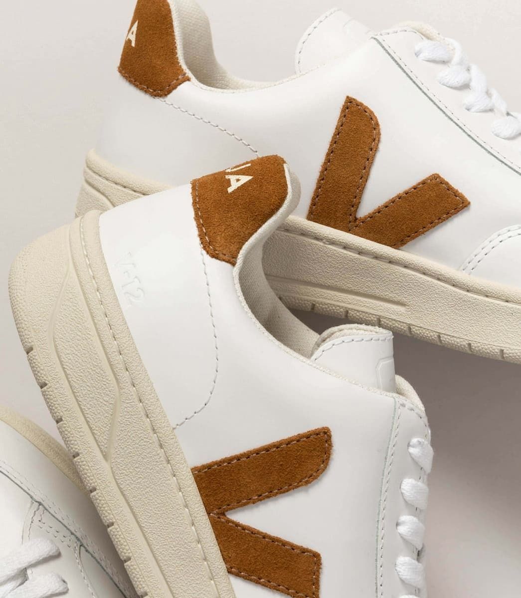 Las V-12 Leather White Camel presentan paneles de cuero y ante con acabado hidrófugo resistente a la lluvia ligera, forro interior Tech suave y acolchado fabricado con 100% poliéster reciclado, el característico logotipo en V de Veja en tono camel producido con ante (26% caucho amazónico, 22% residuos de arroz), así como cordones blancos 100% de algodón orgánico.