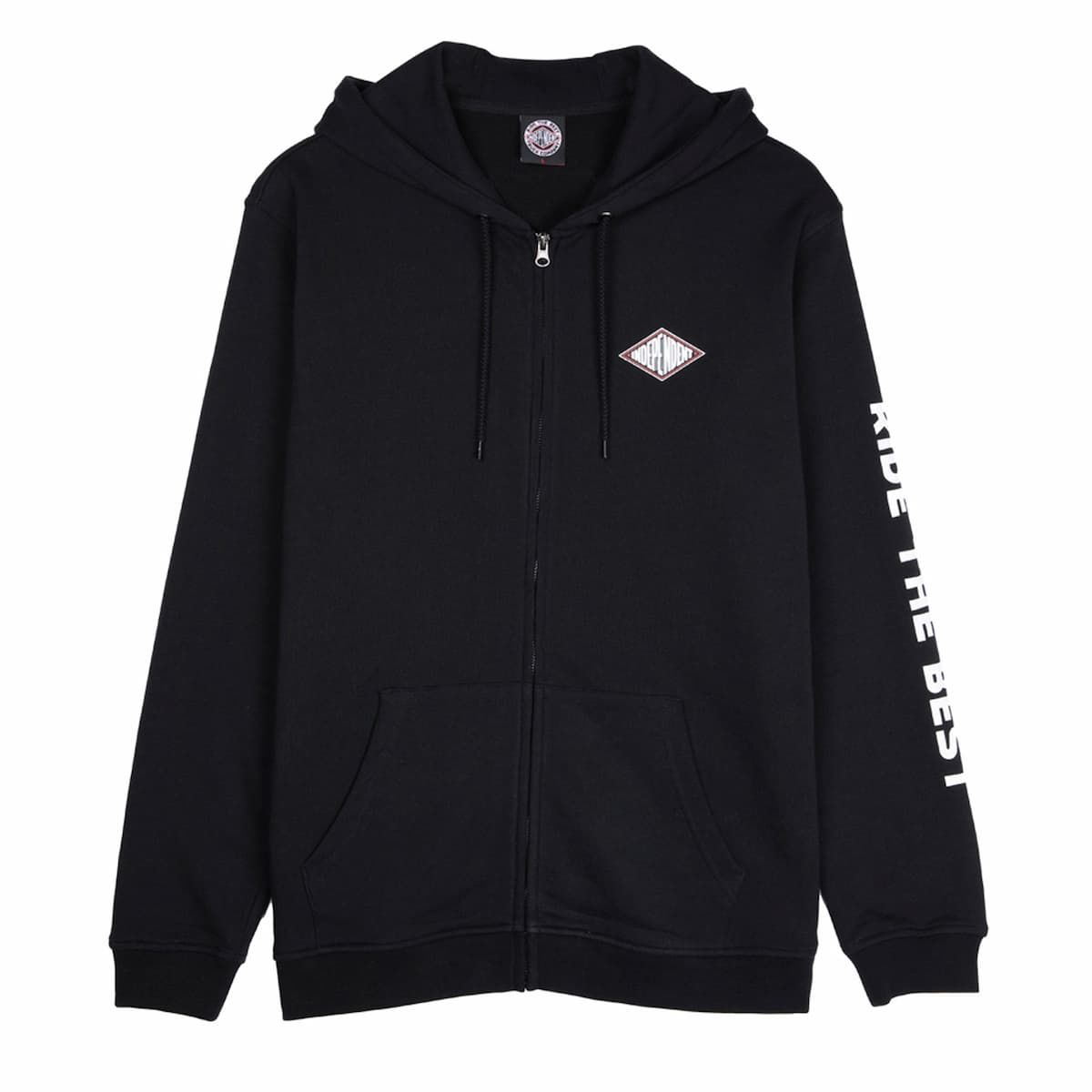 Este Zip Hoodie de ajuste regular cuenta con forro polar de 320 gsm, capucha ajustable mediante cordón, bolsillo tipo canguro, cierre frontal de cremallera, puños y dobladillo en punto canalé, estampado Independent en el lado izquierdo del pecho y en la espalda, junto con la inscripción "Ride The Best" serigrafiada en la manga izquierda.