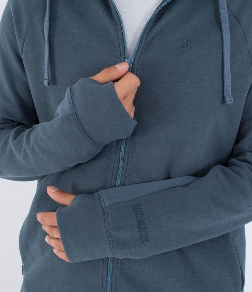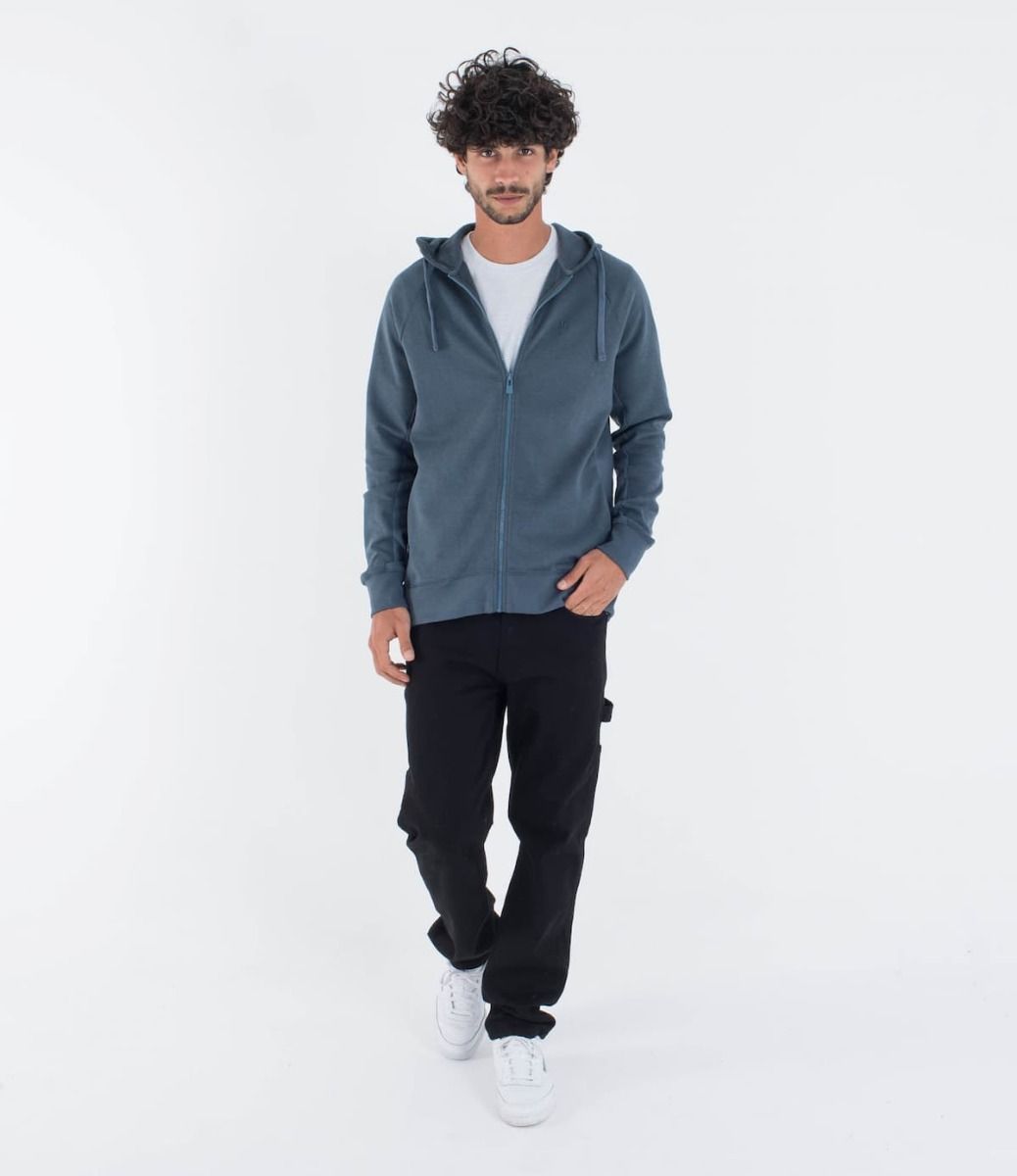 Este cálido zip hoodie Premium azulado cuenta con forro interior, capucha ajustable mediante cordones, cierre frontal de cremallera completa, bolsillo laterales con cremallera, el logo de Hurley bordado en el pecho, bordado MCMXCIX en la manga y bordado "Hurley" en la capucha.
